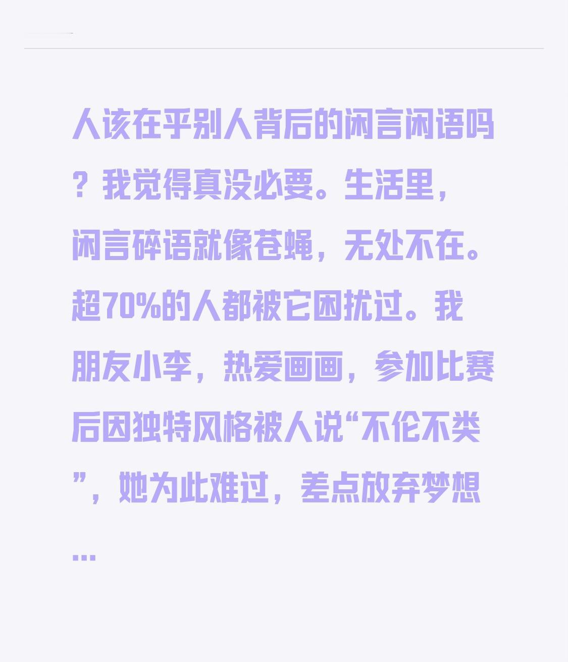 生活里,闲言碎语就像苍蝇,无处不在。超70%的人都被它困扰过。我朋友小李,热爱画画,参加比赛后因独特风格被人说“不伦不类”,她为此难过,差点放弃梦想。