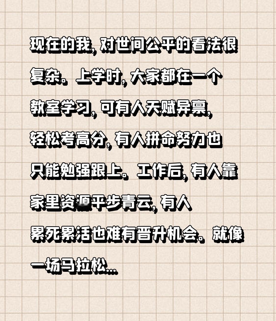 但我也看到,很多出身平凡的人,通过自己的坚持和奋斗,实现了逆袭。所以,世间没有绝对的公平,但我们可以在不公平中寻找自己的公平,用努力去打破那些既定的差距。