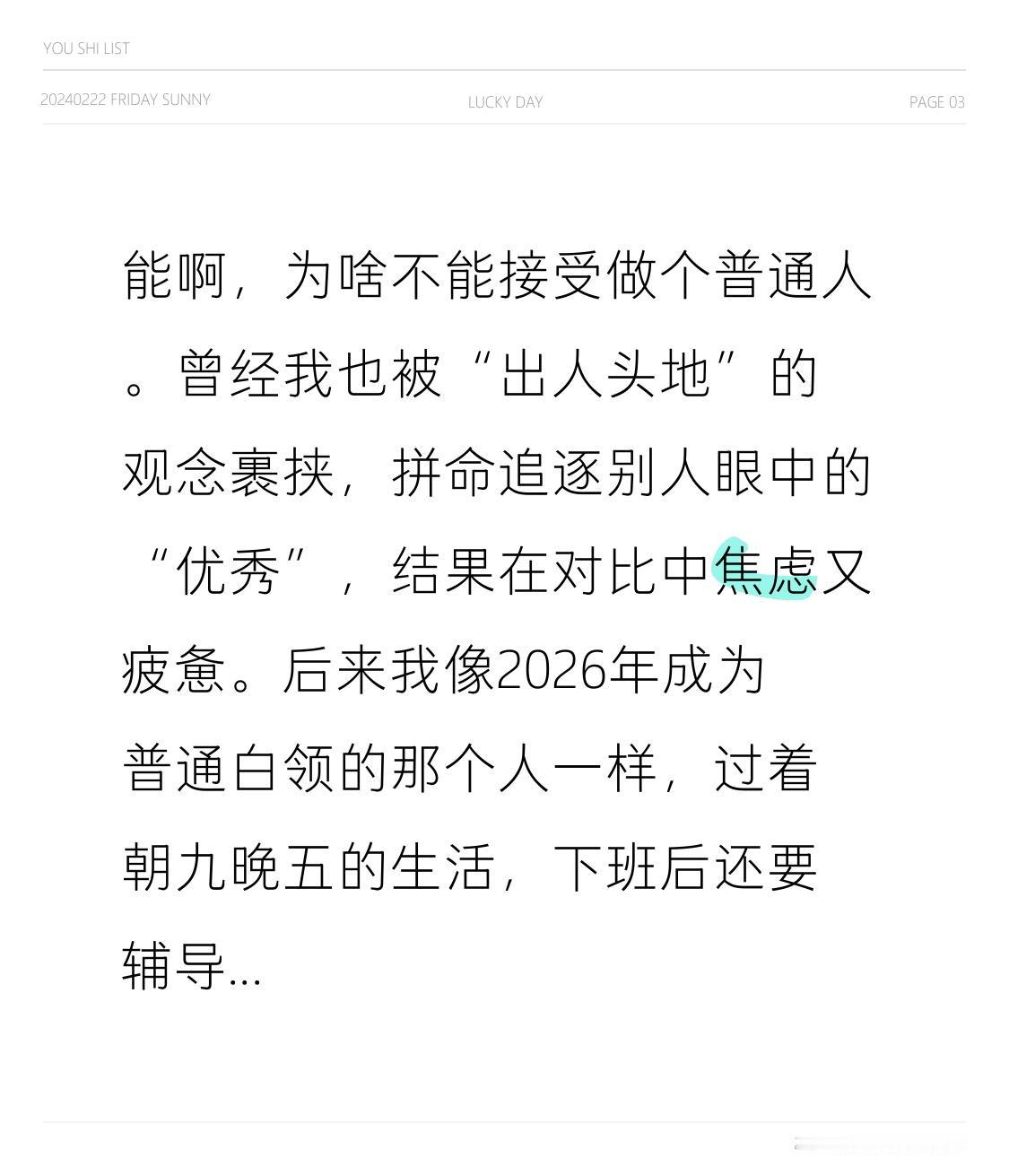 能啊,为啥不能接受做个普通人。曾经我也被“出人头地”的观念裹挟,拼命追逐别人眼中的“优秀”,结果在对比中焦虑又疲惫。