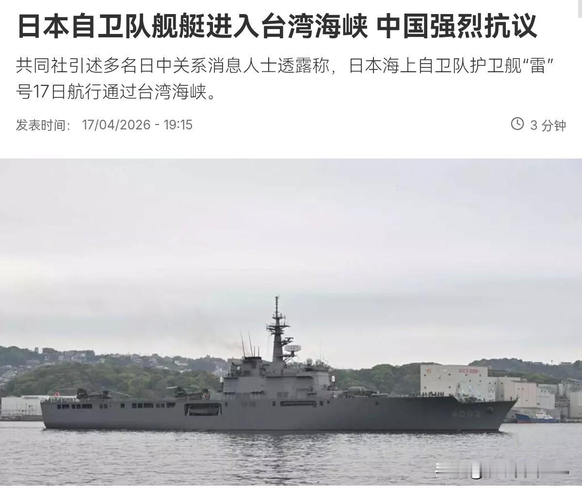 中国明确主张台湾是中国领土、对台湾海峡拥有管辖权,日本不仅声称要对此进行应对,更直接采取了挑衅性动作。4月18日法新社发布报道称,日本自卫队舰艇进入台湾海峡,这一行为当即引发中国的强烈抗议。值得注意的是,这是自去年10月日本高市政权上台后,首次被曝出海上自卫队舰艇过航台湾海峡的情况。