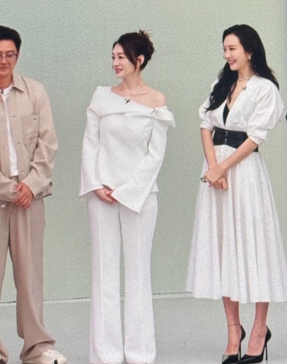 李小冉上身穿白色露肩装,下身搭配白色裤子,让她秀出了很好的身材比例,和迷人的香肩。