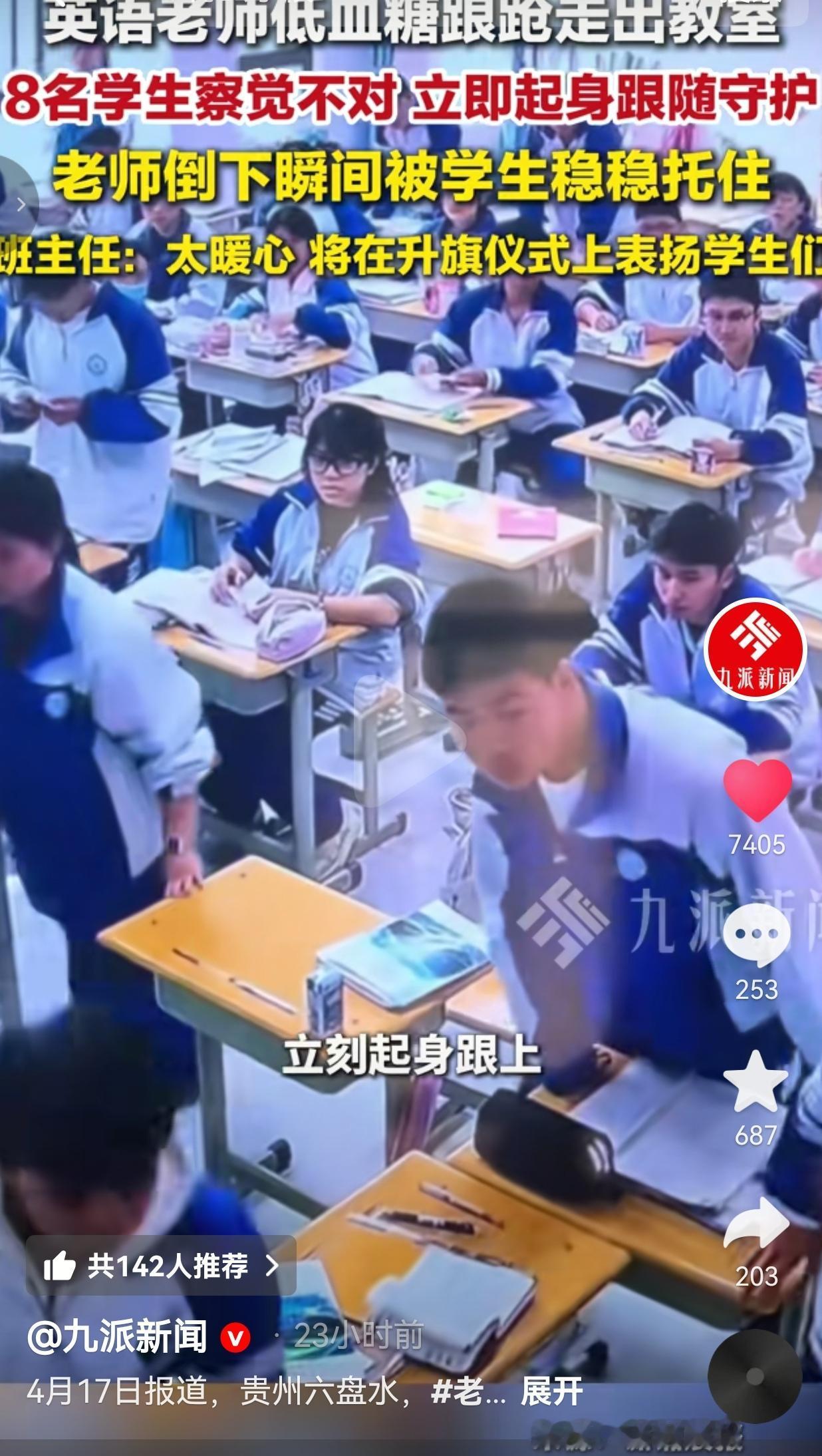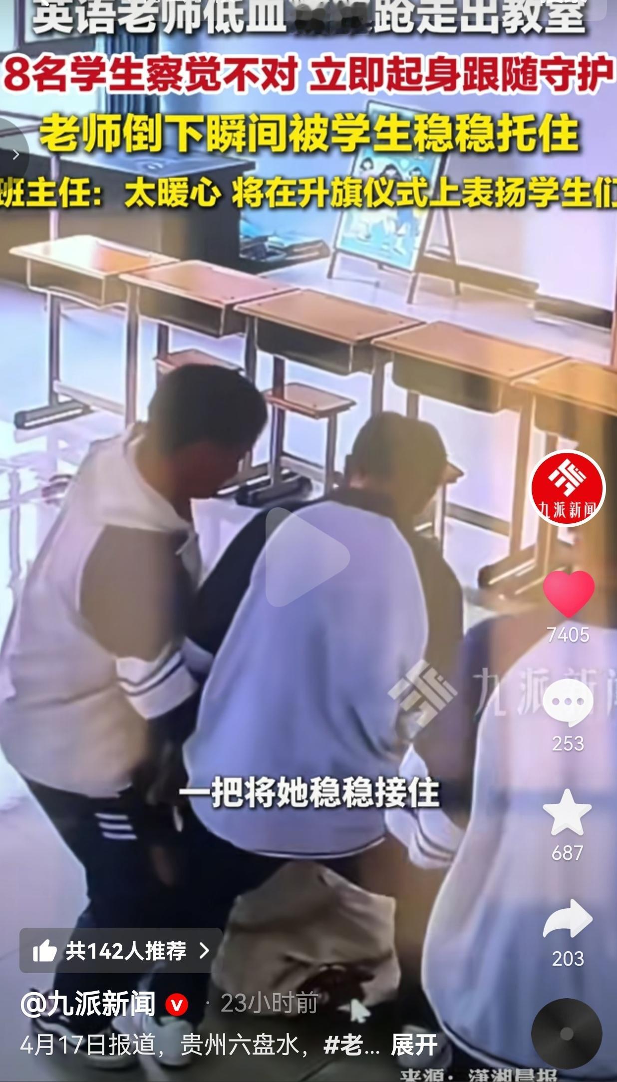这件事发生在贵州六盘水的一间教室里。那天早自习,英语老师突然低血糖犯了,意识都开始模糊,脚步发飘,撑不住想自己走出教室透透气。