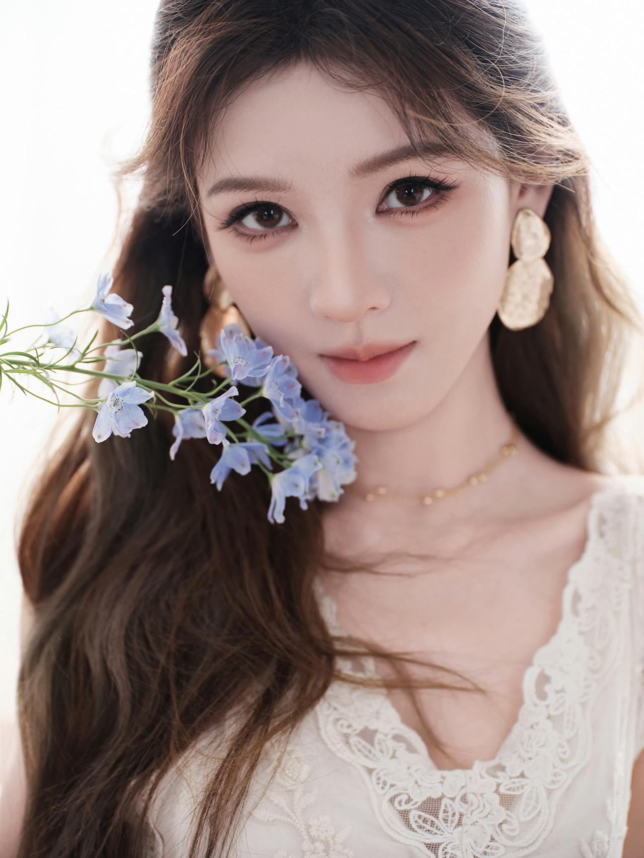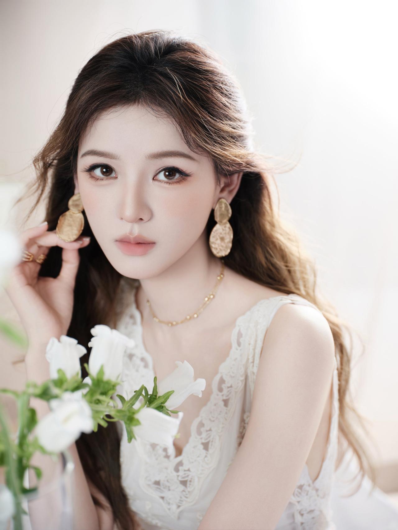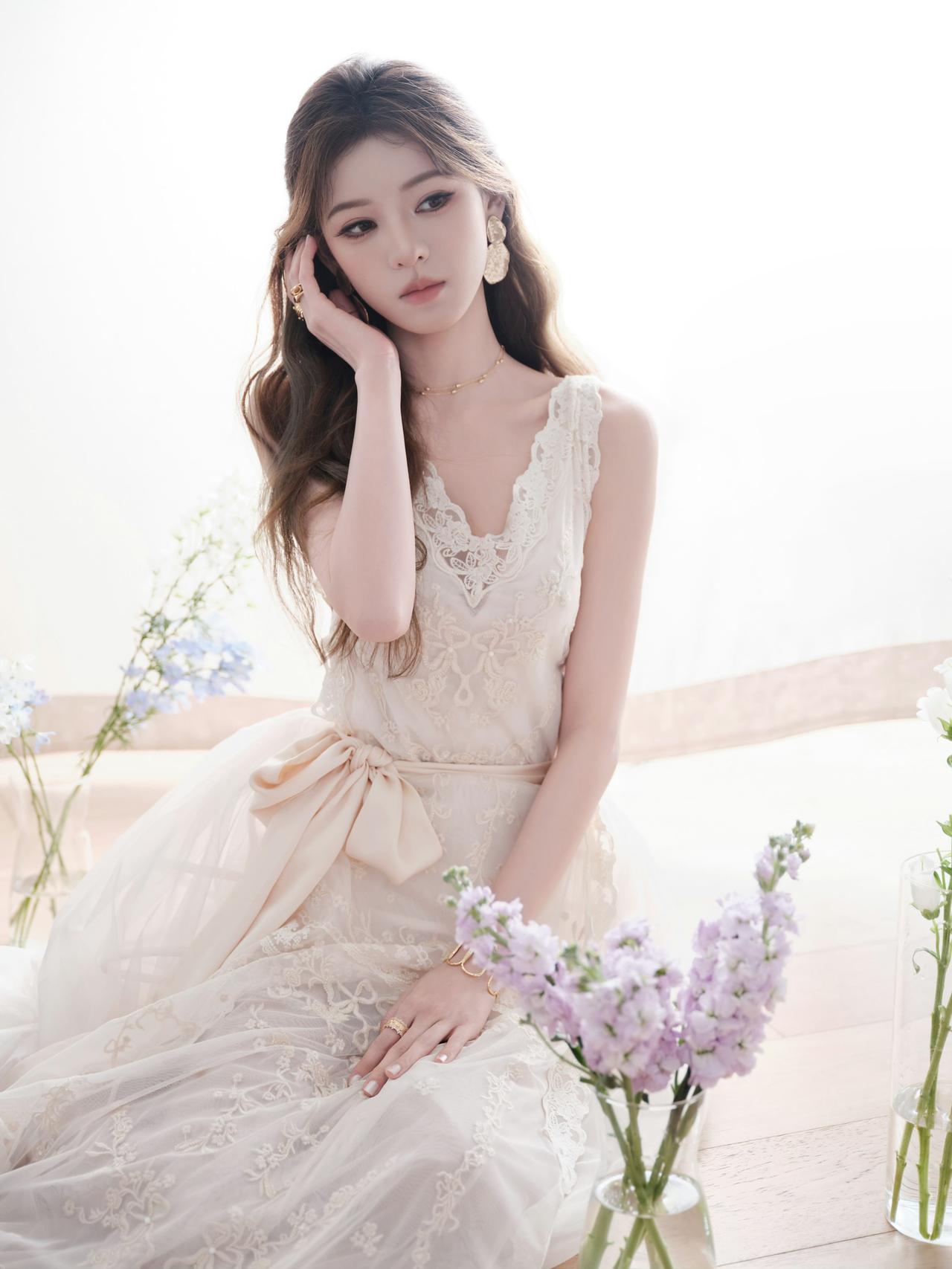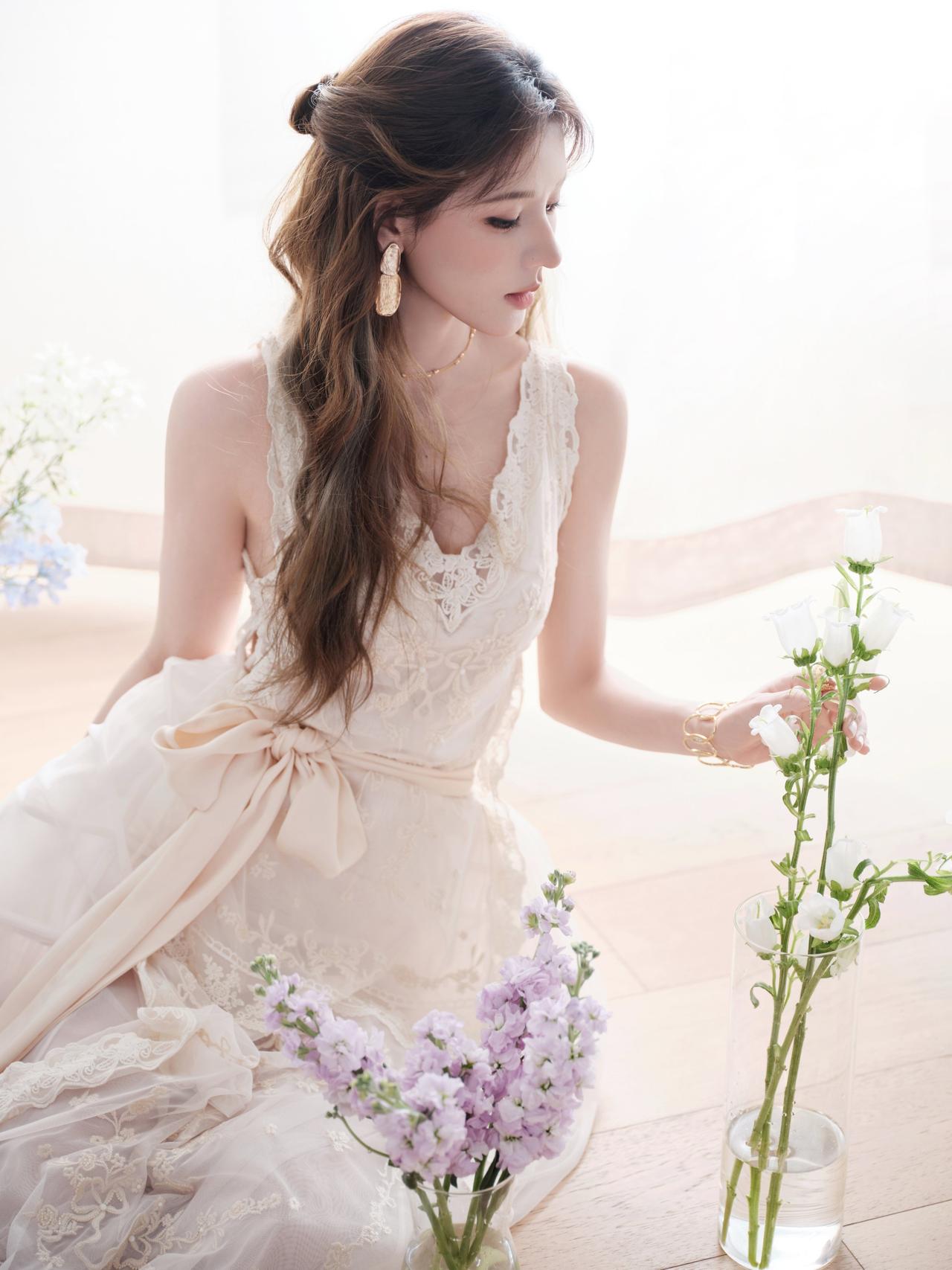 张予曦身着一袭带有蕾丝花纹的浅色无袖长裙,赤脚坐在铺有木地板的室内,手中握着花枝,身旁的透明花瓶里也插着花枝,整体场景清新雅致,尽显温柔仙女气质。