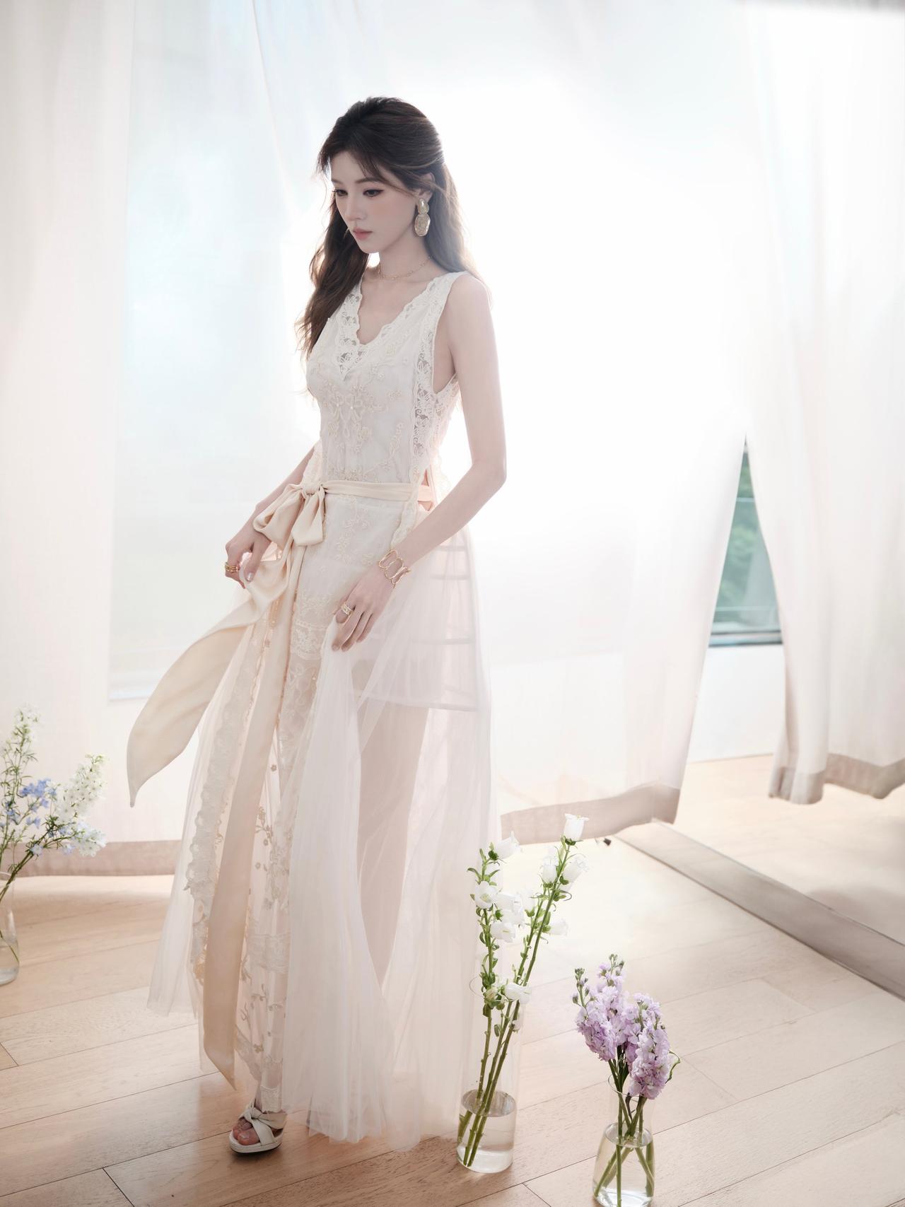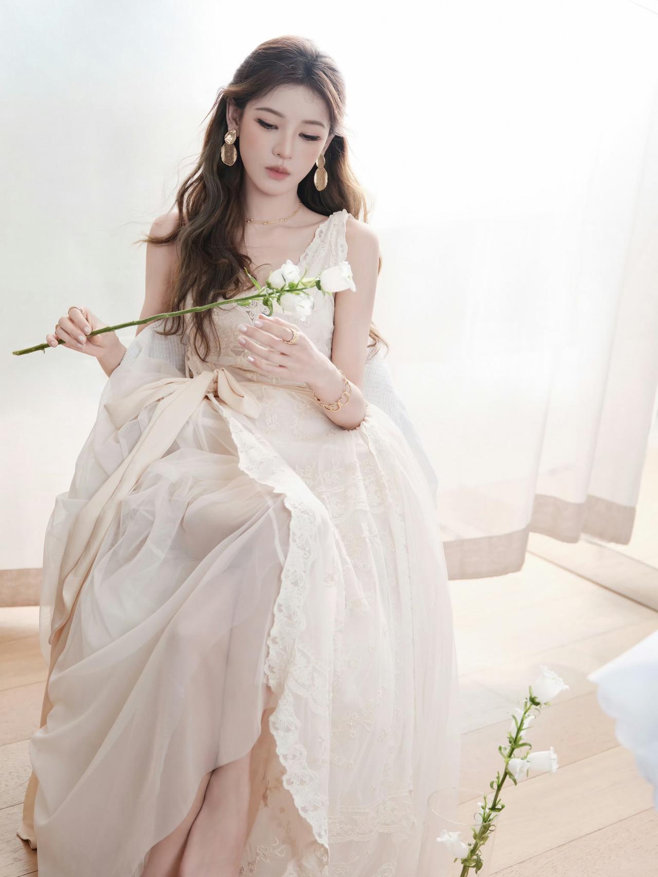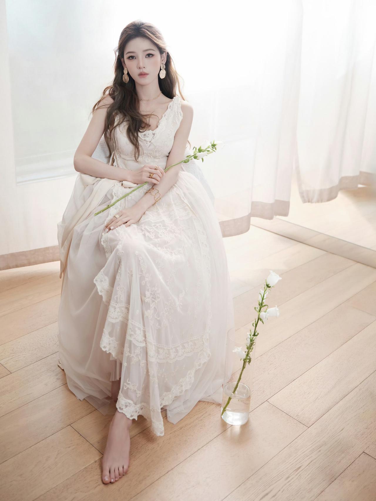 张予曦身着一袭带有蕾丝花纹的浅色无袖长裙,赤脚坐在铺有木地板的室内,手中握着花枝