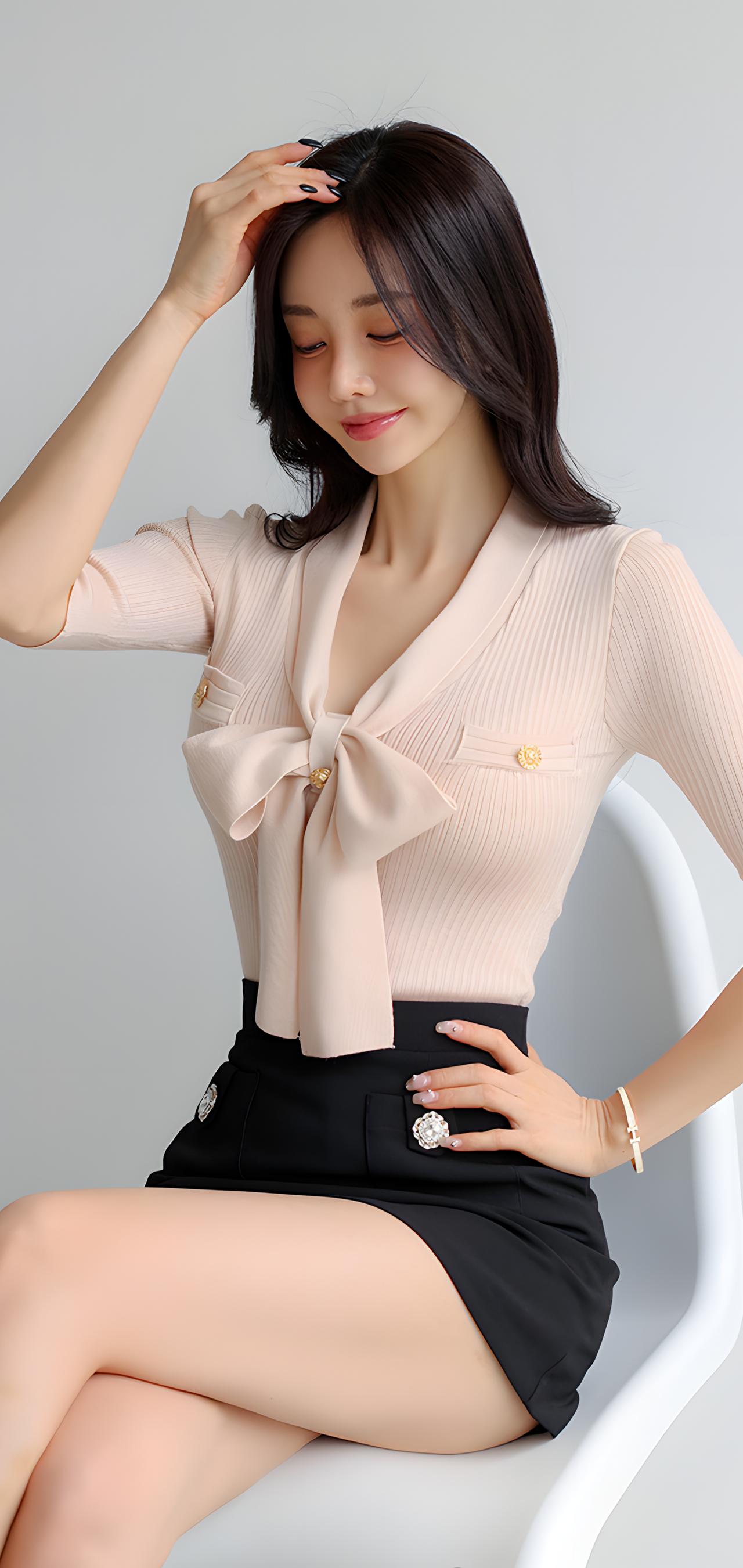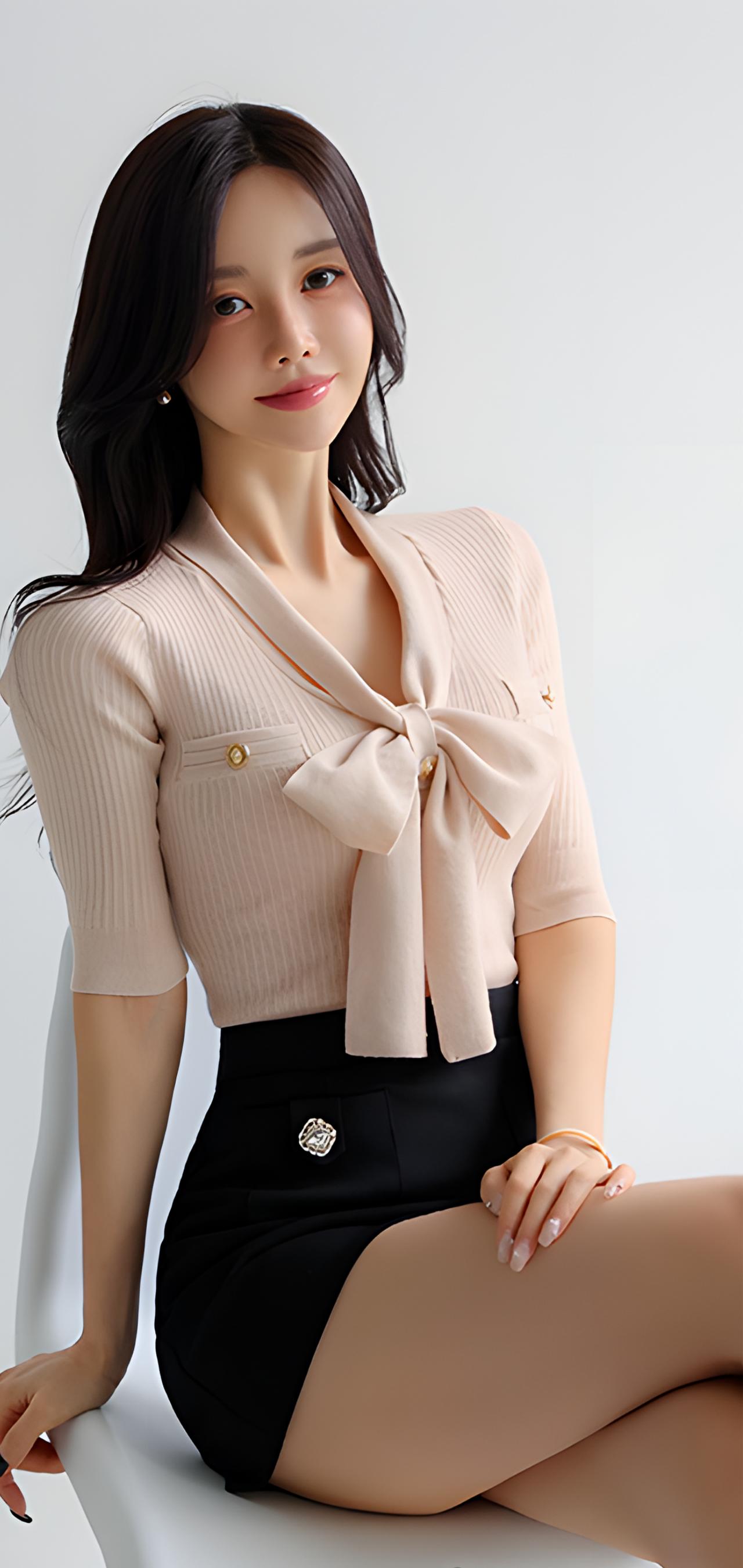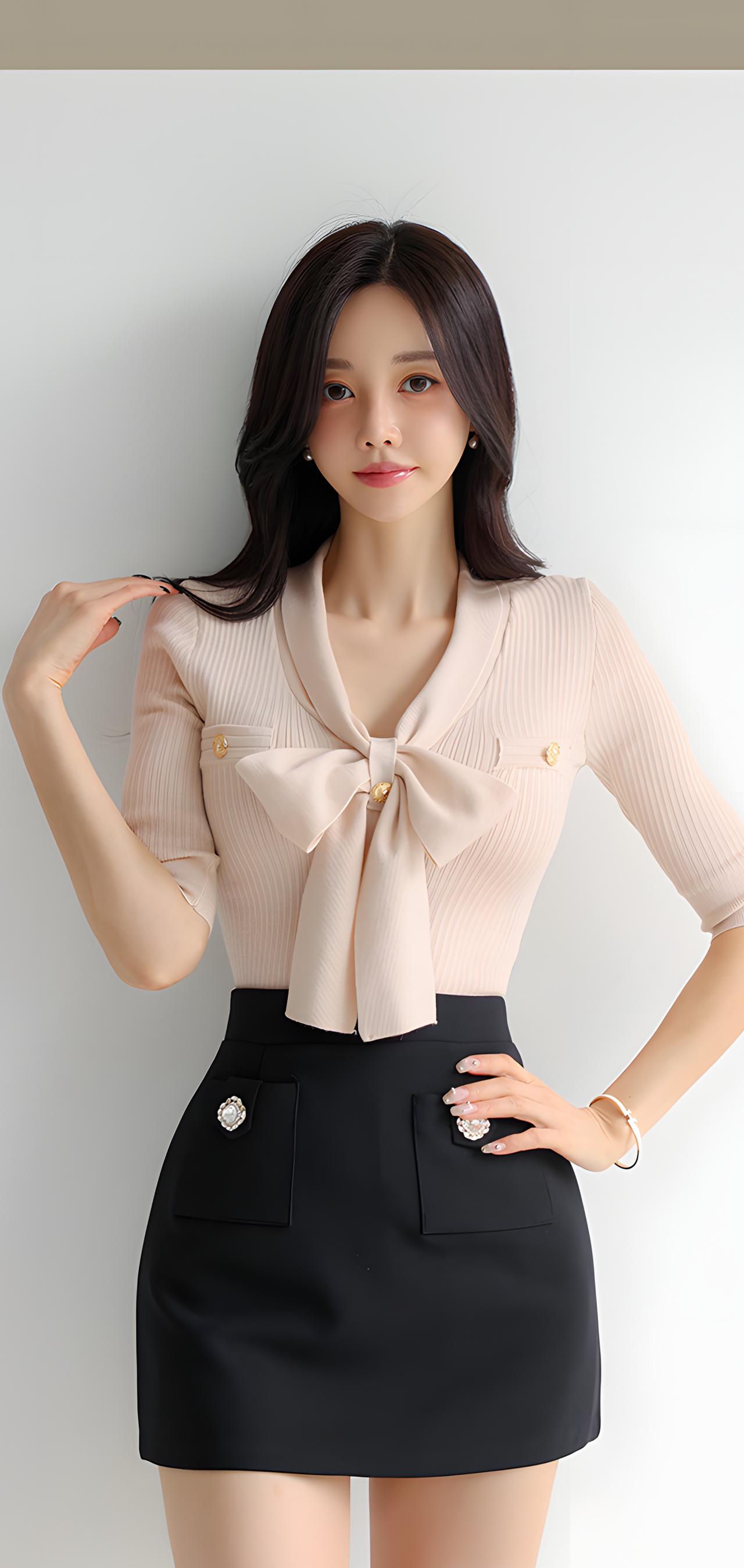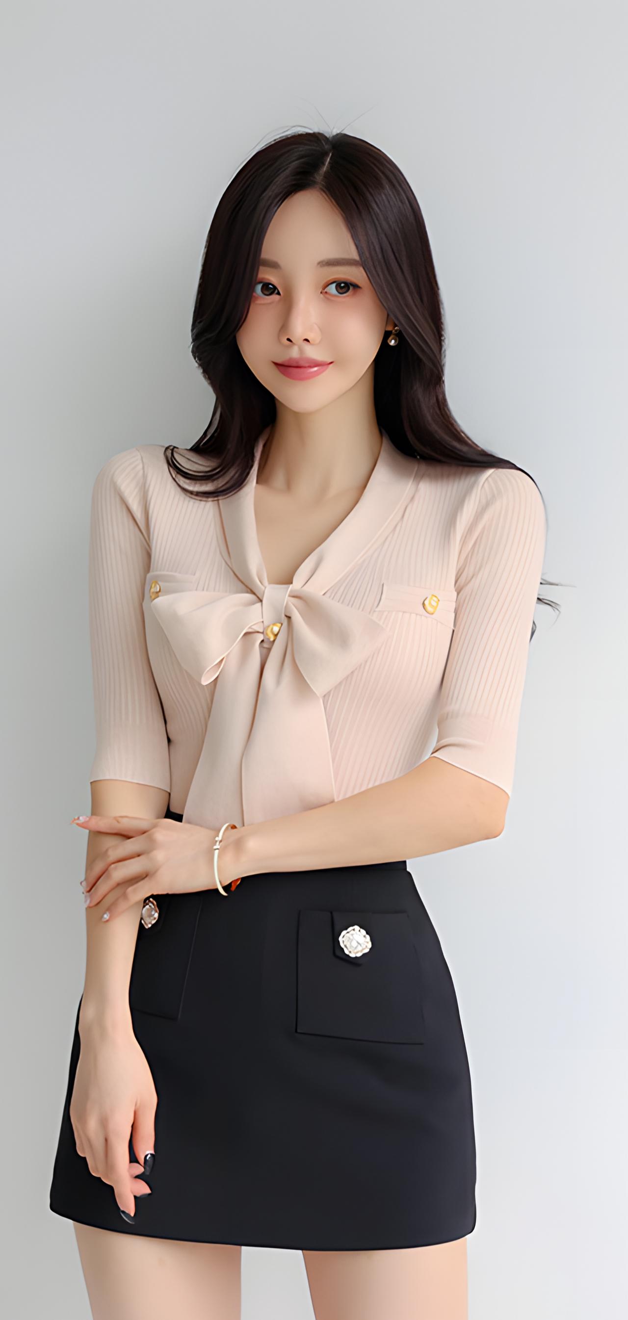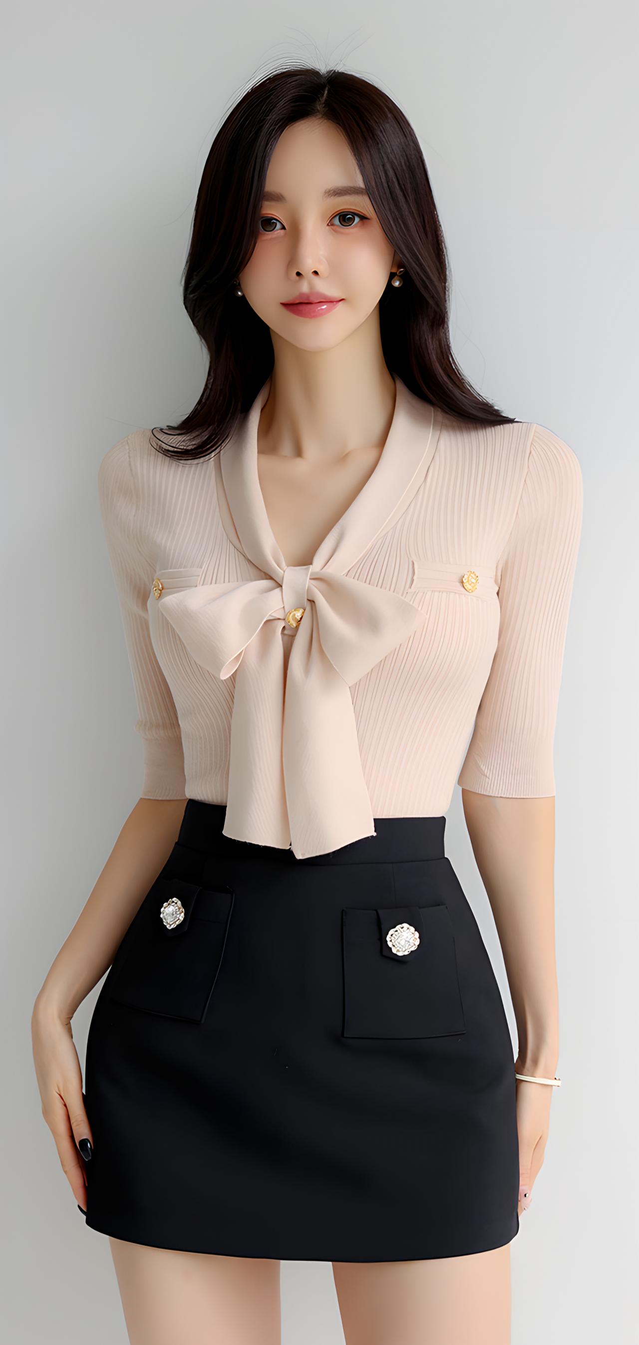 优雅气质穿搭,粉色蝴蝶结上衣搭配黑色短裙,尽显女性魅力!
