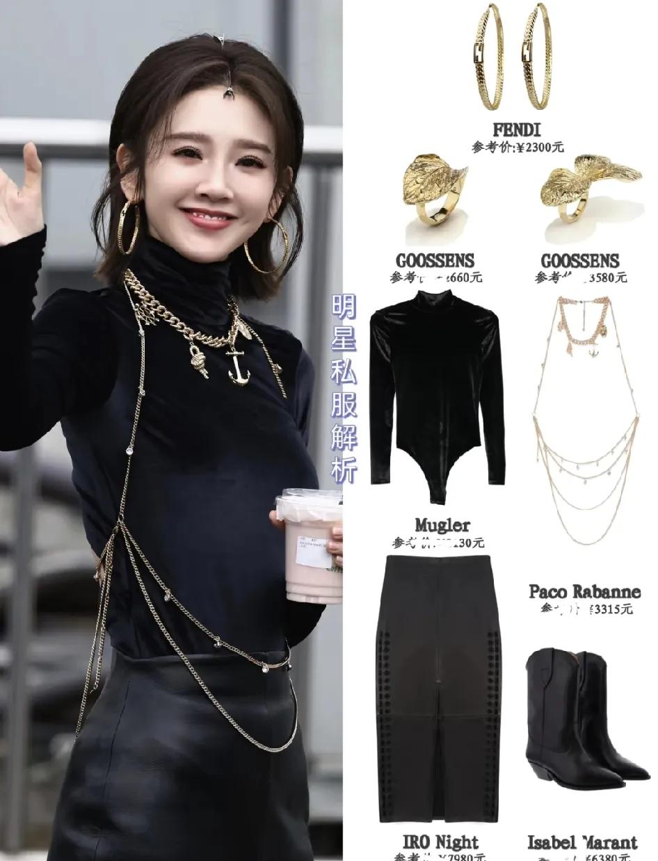 比如这套给色连体衣加皮质包裙,整体看起来时尚大气。她的圆圈金属耳环,和金属戒指,看起来又多了点复古感。
