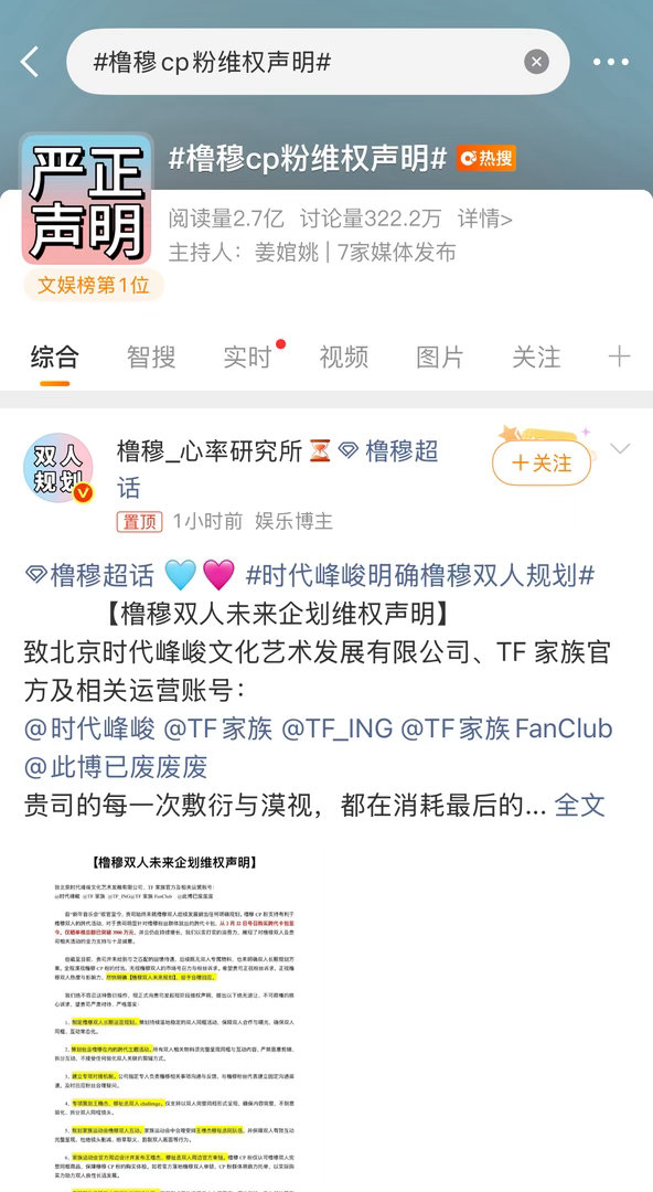 橹穆cp粉发布维权声明,向公司提出双人待遇。