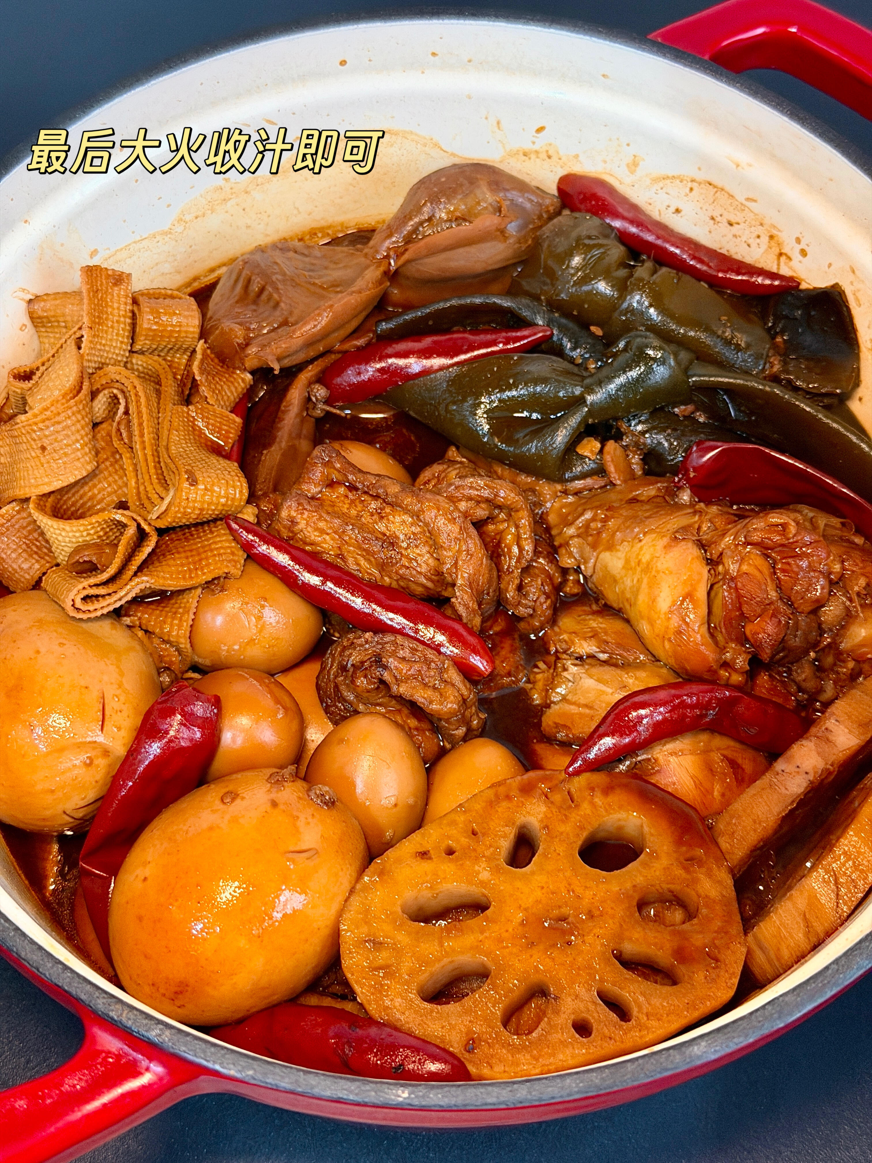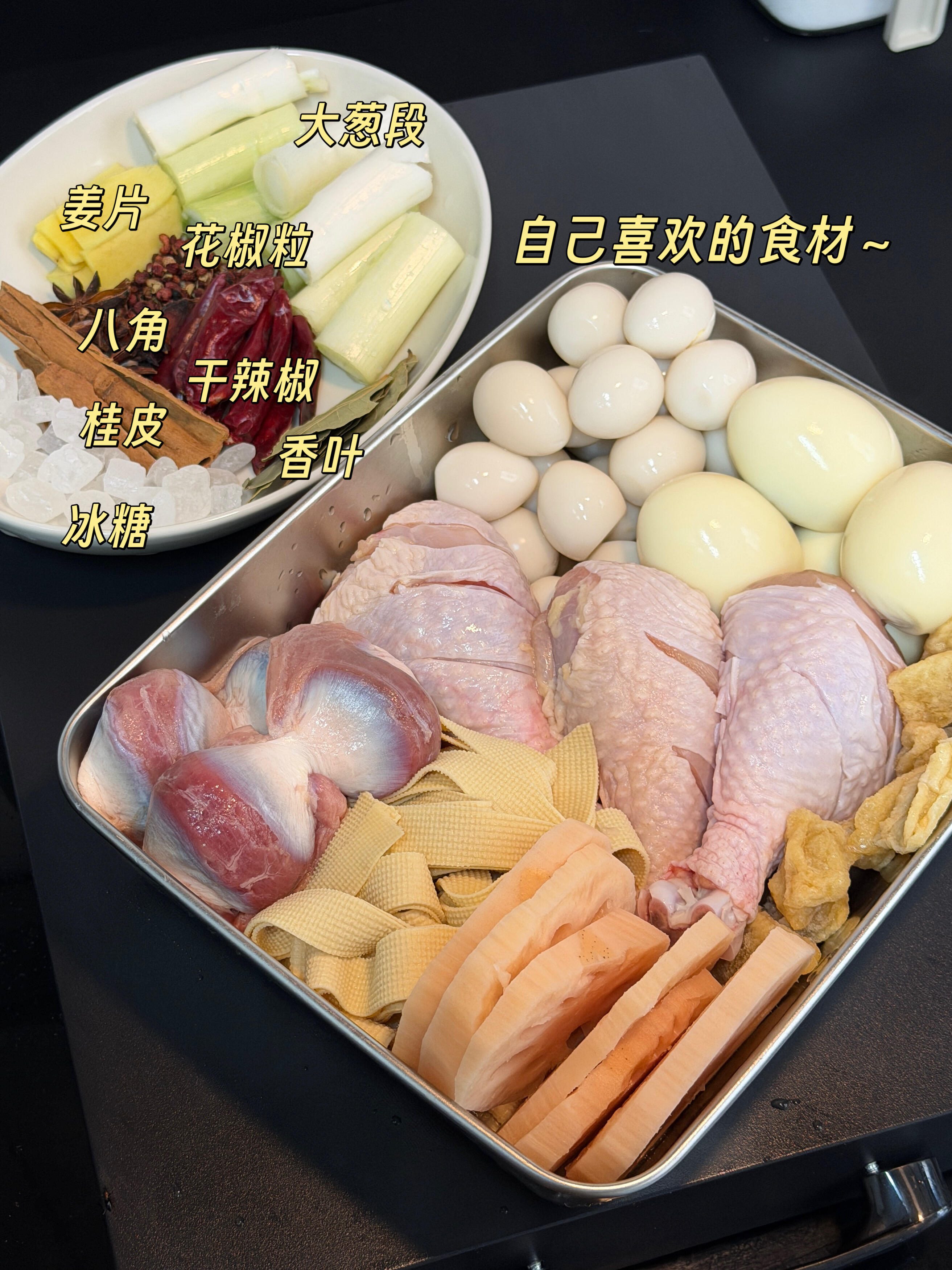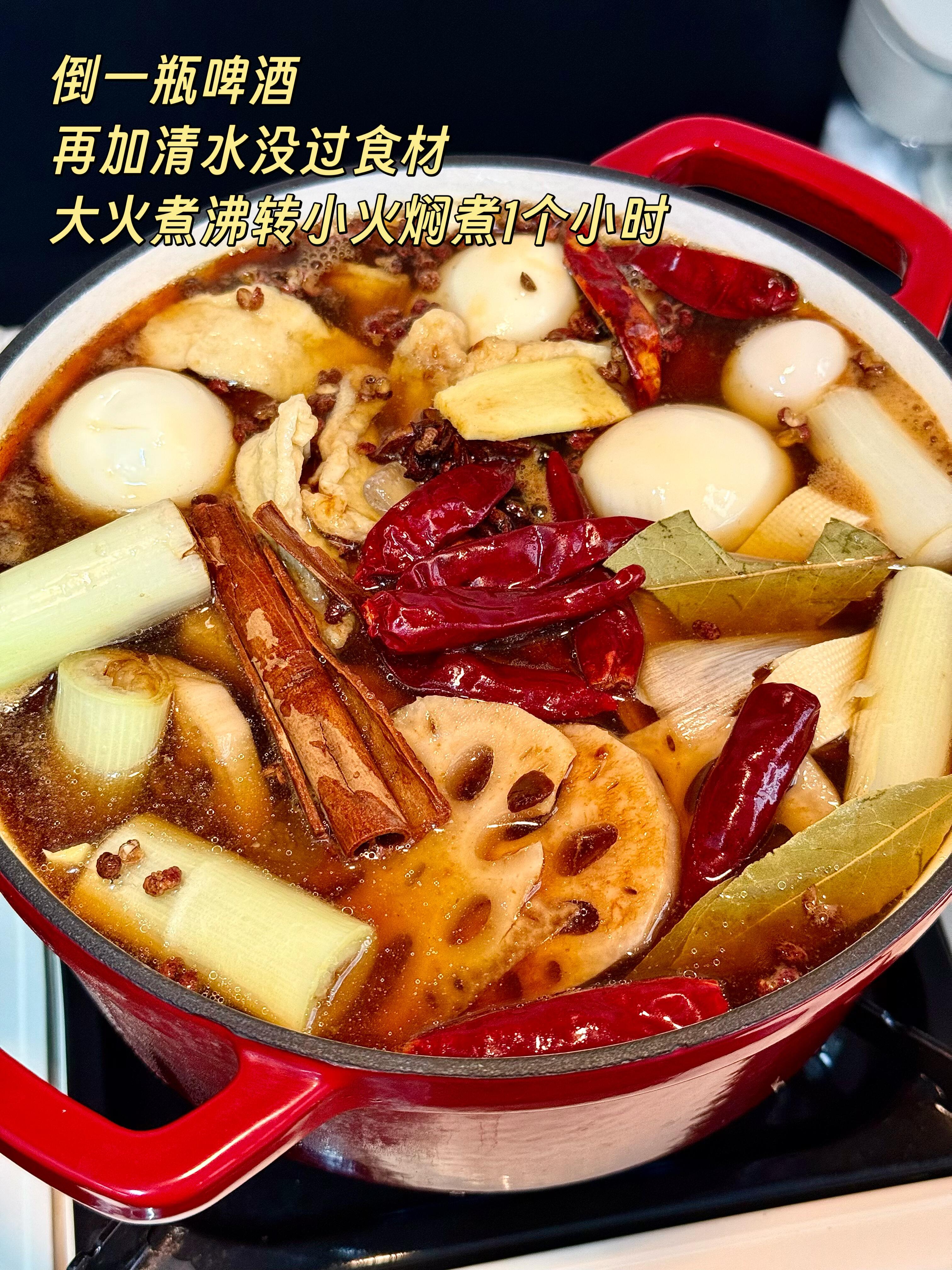 🛒 准备食材:(按需搭配)自己爱吃的食材(鸡腿、鸡蛋、豆干、海带都可)、干辣椒、姜片、香叶、桂皮、花椒、大葱段、冰糖、料酒、生抽、老抽、蚝油、啤酒、豆瓣酱