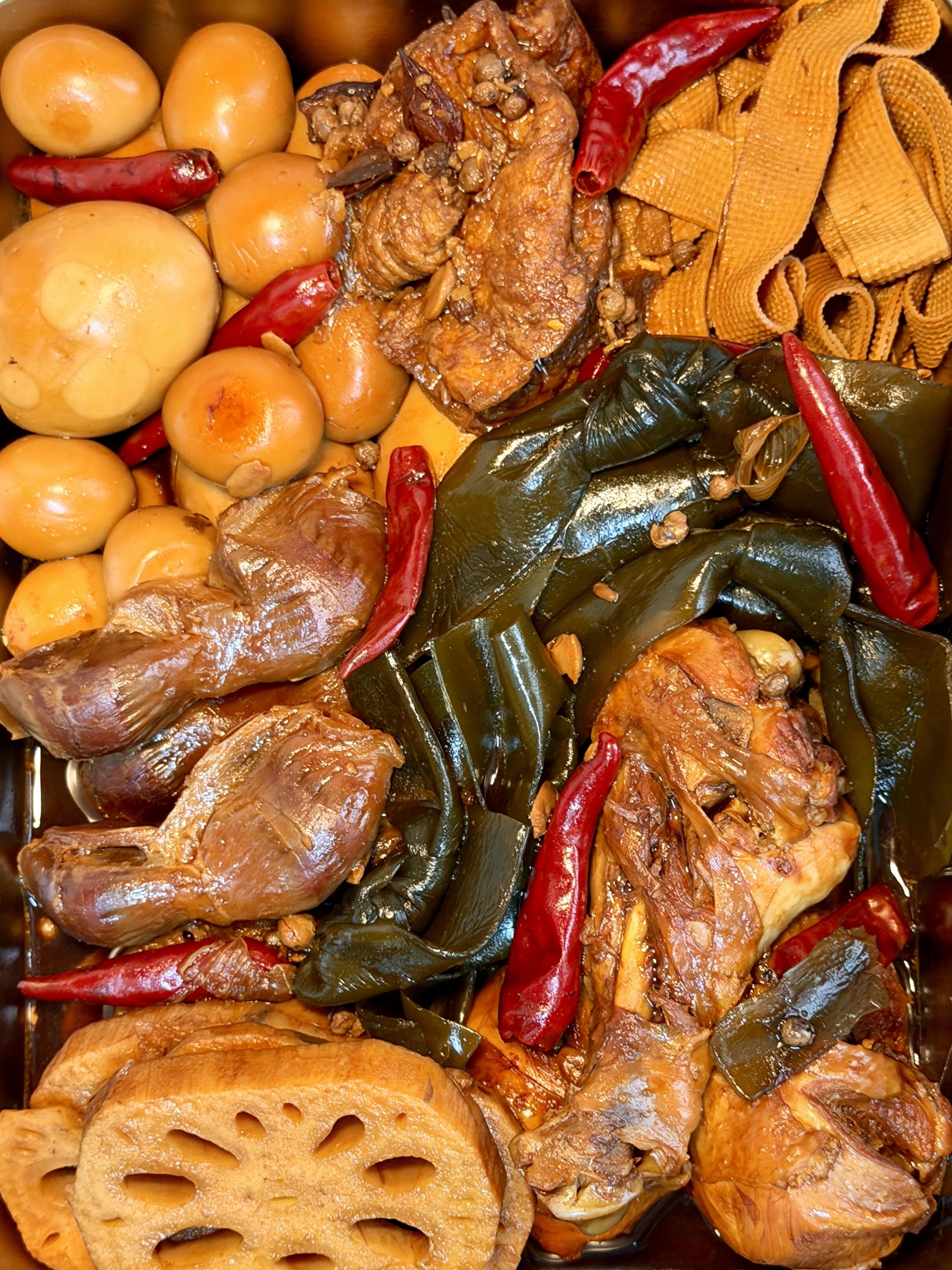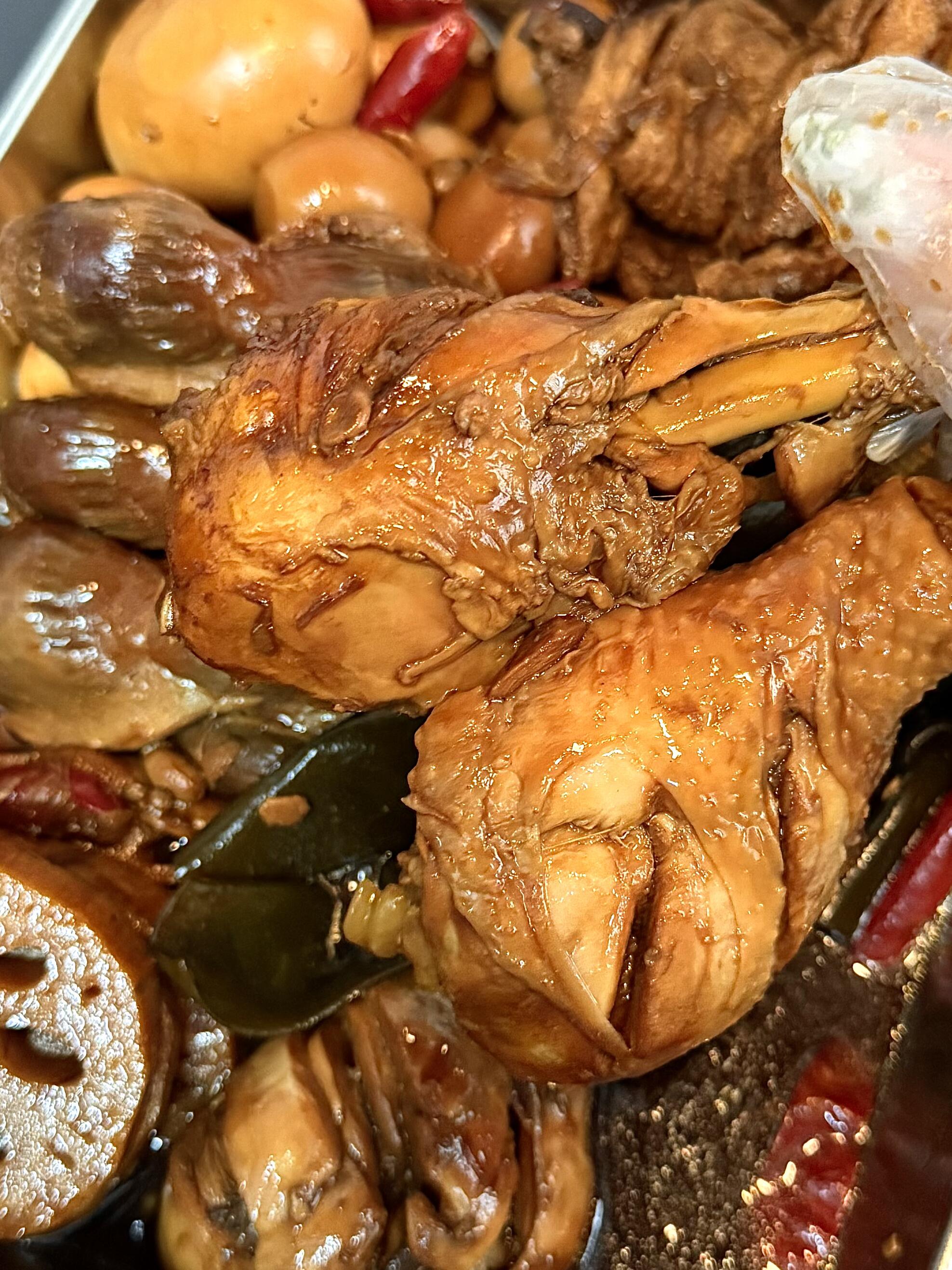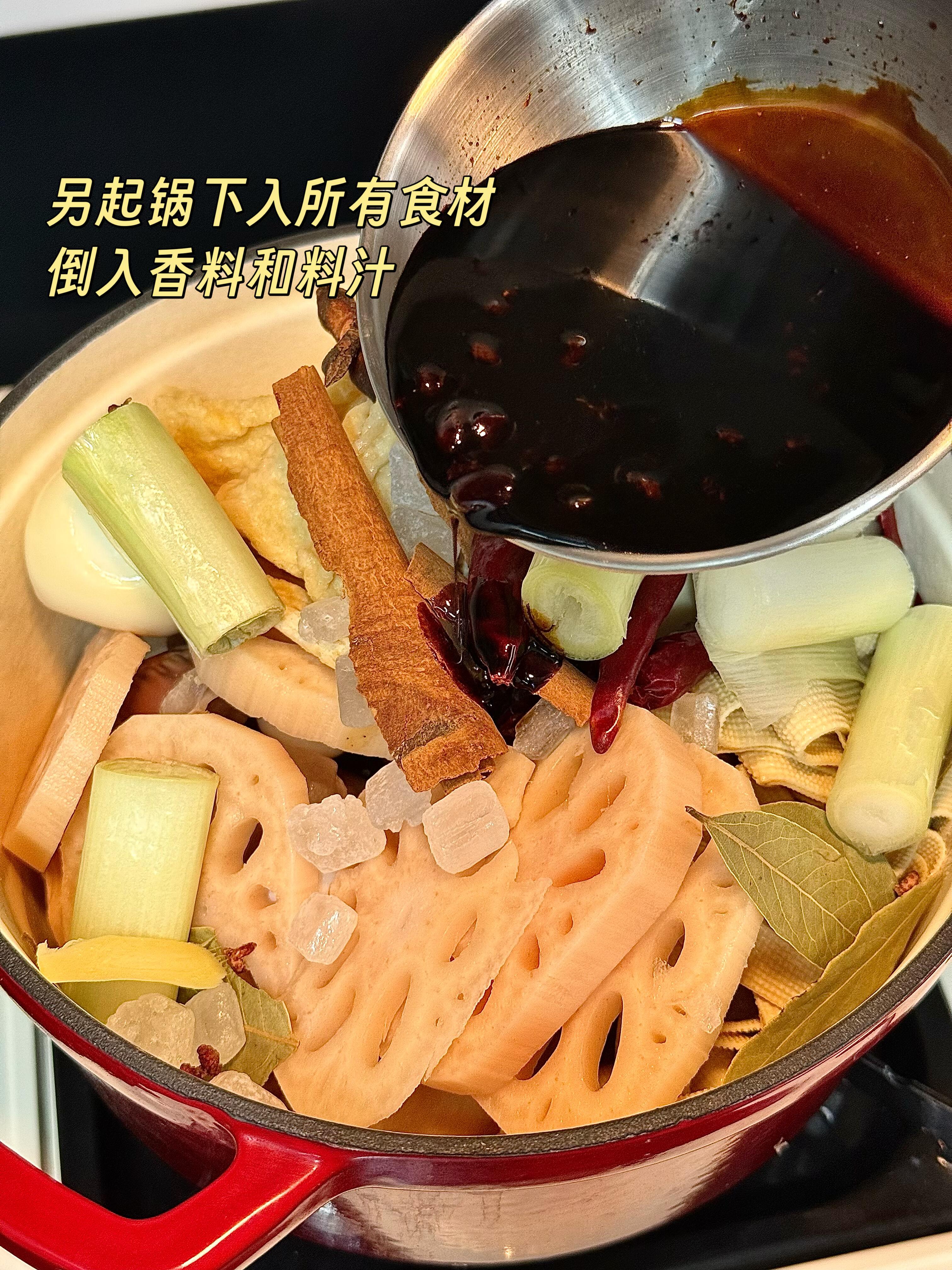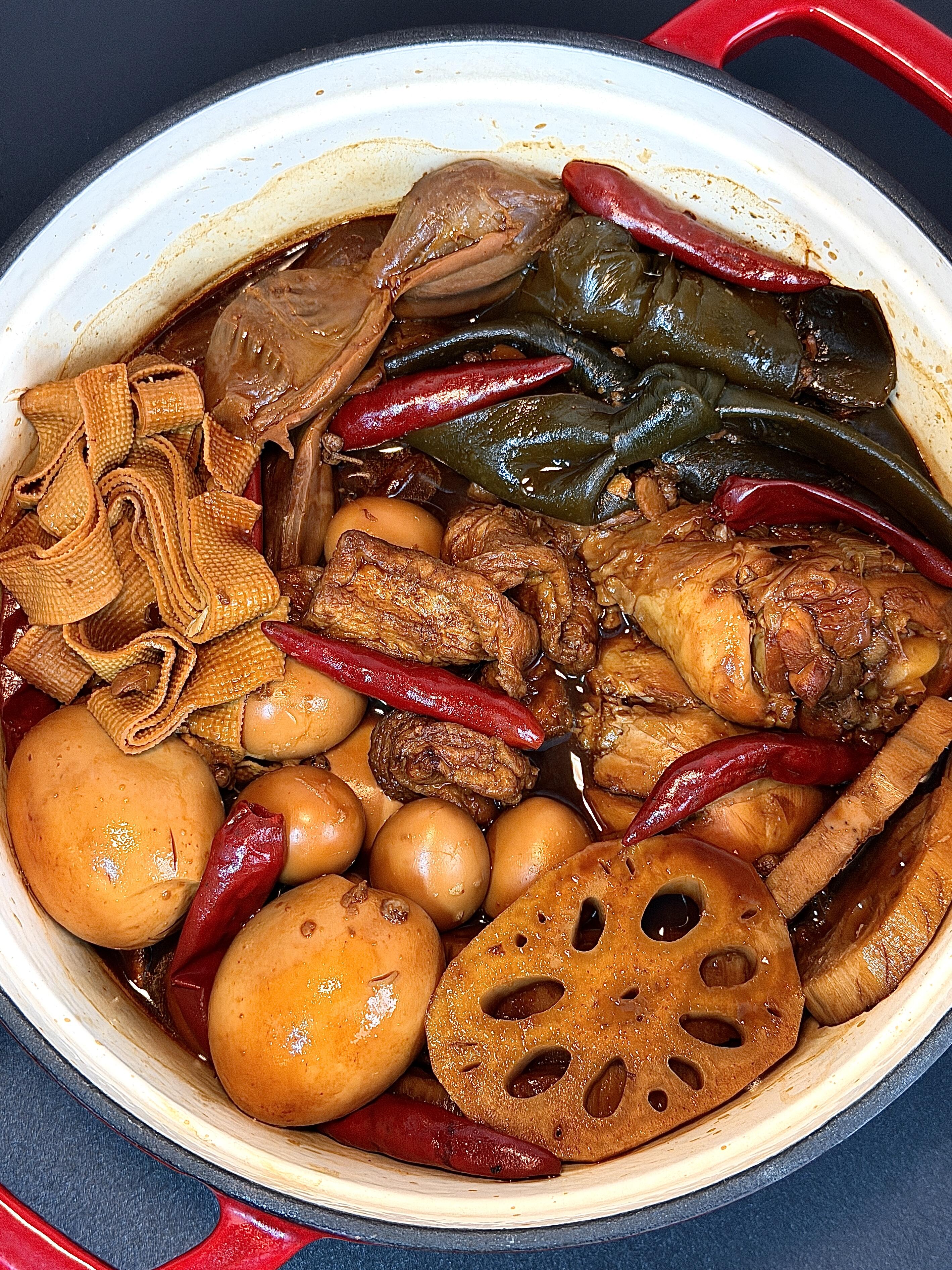 🛒 准备食材:(按需搭配)自己爱吃的食材(鸡腿、鸡蛋、豆干、海带都可)、干辣椒、姜片、香叶、桂皮、花椒、大葱段、冰糖、料酒、生抽、老抽、蚝油、啤酒、豆瓣酱
