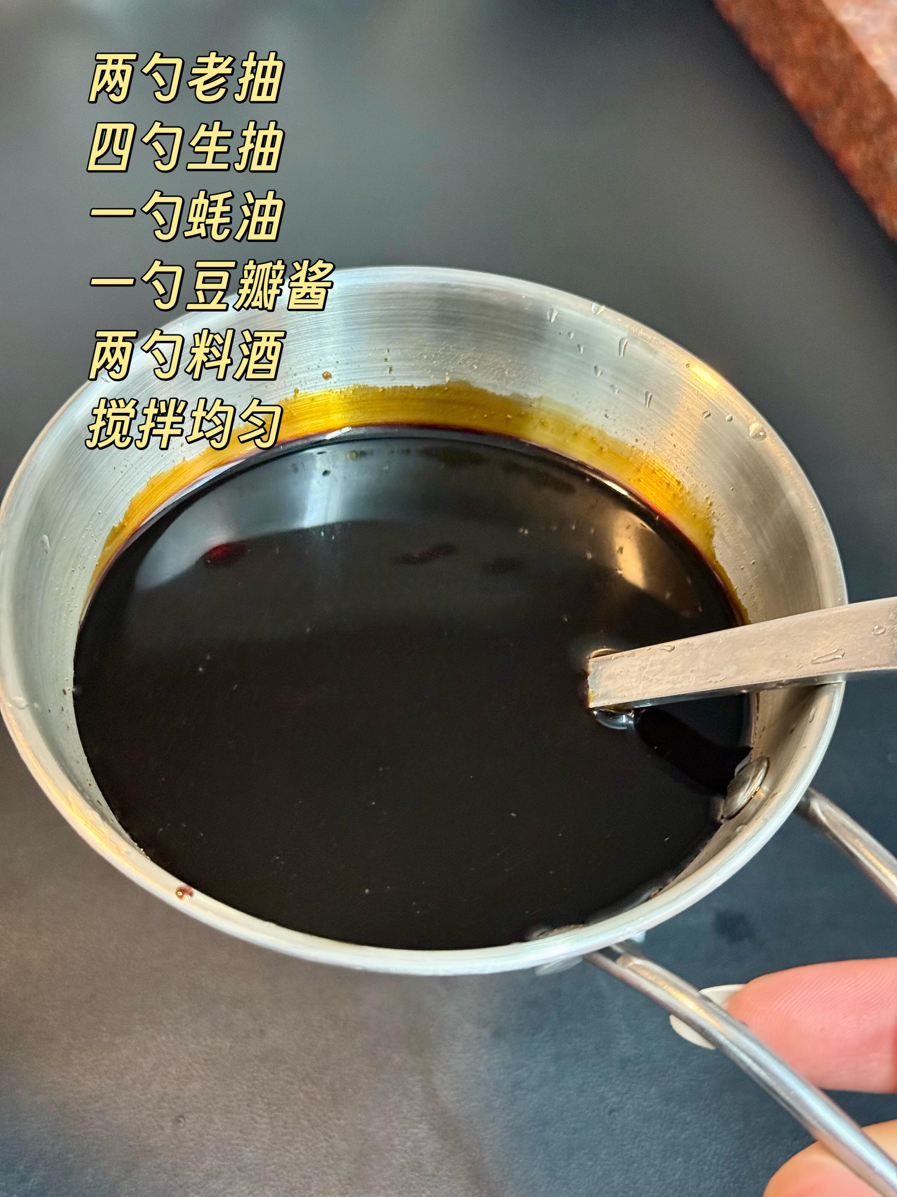 2️⃣ 调万能料汁:碗里加2勺老抽(上色)、4勺生抽(提鲜)、1勺蚝油、1勺豆瓣酱、2勺料酒,搅拌均匀,这样调出来的料汁,卤啥都香!