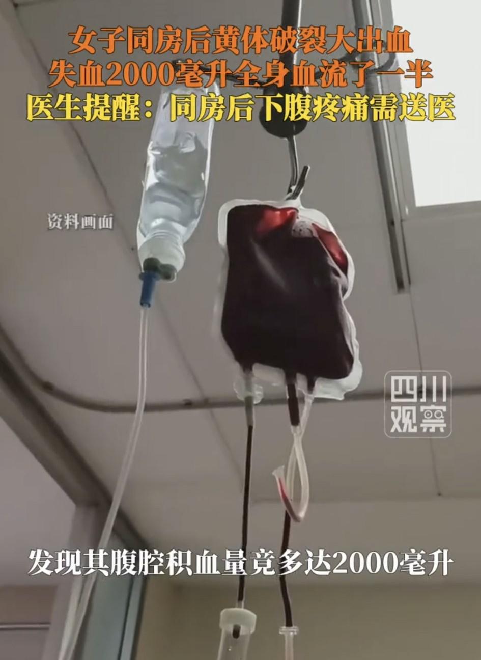 果然不出医生所料,检查发现,女子此时腹腔内已经存在大量积血了,预计高达两千毫升,相当于一个正常人血量的一半。后续医生也很快找到了女子的失血根源,正是其体内黄体破裂导致。