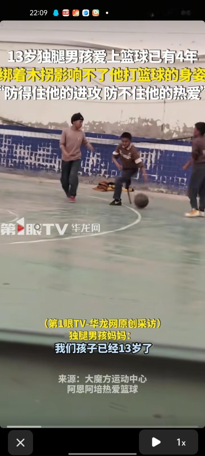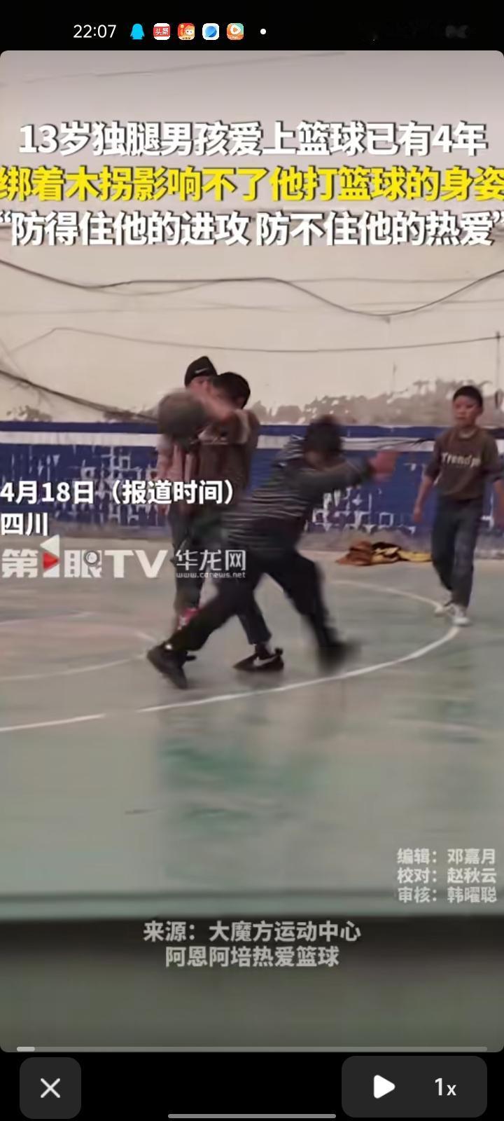 4月15日,凉山州西昌市。13岁独腿男孩爱上篮球已有四年,绑着木拐影响不了他打篮球的身姿。 男孩妈妈称,他是四岁四个月时被石头砸断腿的,只能截肢,喜欢篮球的话,四五年前她一个人心里很难过,后来打篮球时慢慢地难过的事情都忘了,篮球能代表他的快乐