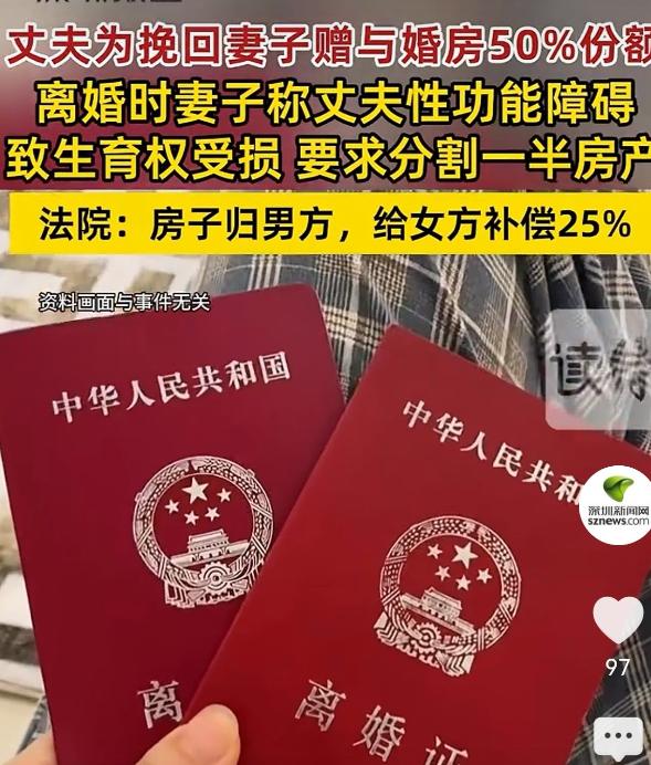 广东深圳,女子结婚一年多后,丈夫床上的事就不给力,后来干脆不行了,女子忍受不了了,连孩子都给不了的男人有何用?为了哄妻子缓和关系,丈夫决定将父母在婚前赠与自己的房子加上妻子名字,想以此稳固婚姻。谁知,又维系了2年,妻子仍以丈夫的功能障碍剥夺了她生育权起诉离婚并分割房产的50%。男子答应离婚,可房子是为了保住婚姻给她的,要离婚就不能分她一半!那是婚前财产!法院判决意想不到!