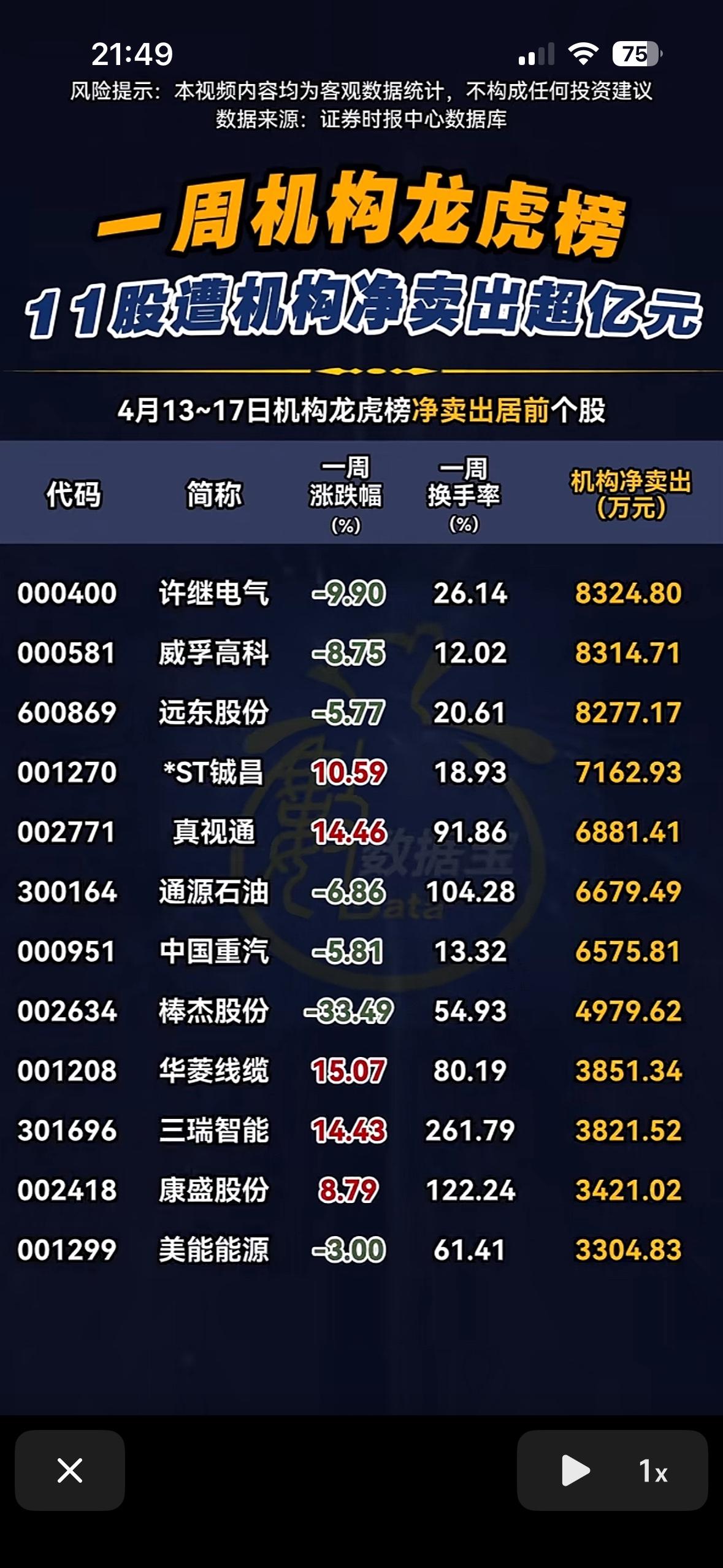 4月13日—4月17日一周机构龙虎榜揭晓!11股净卖出超亿元!