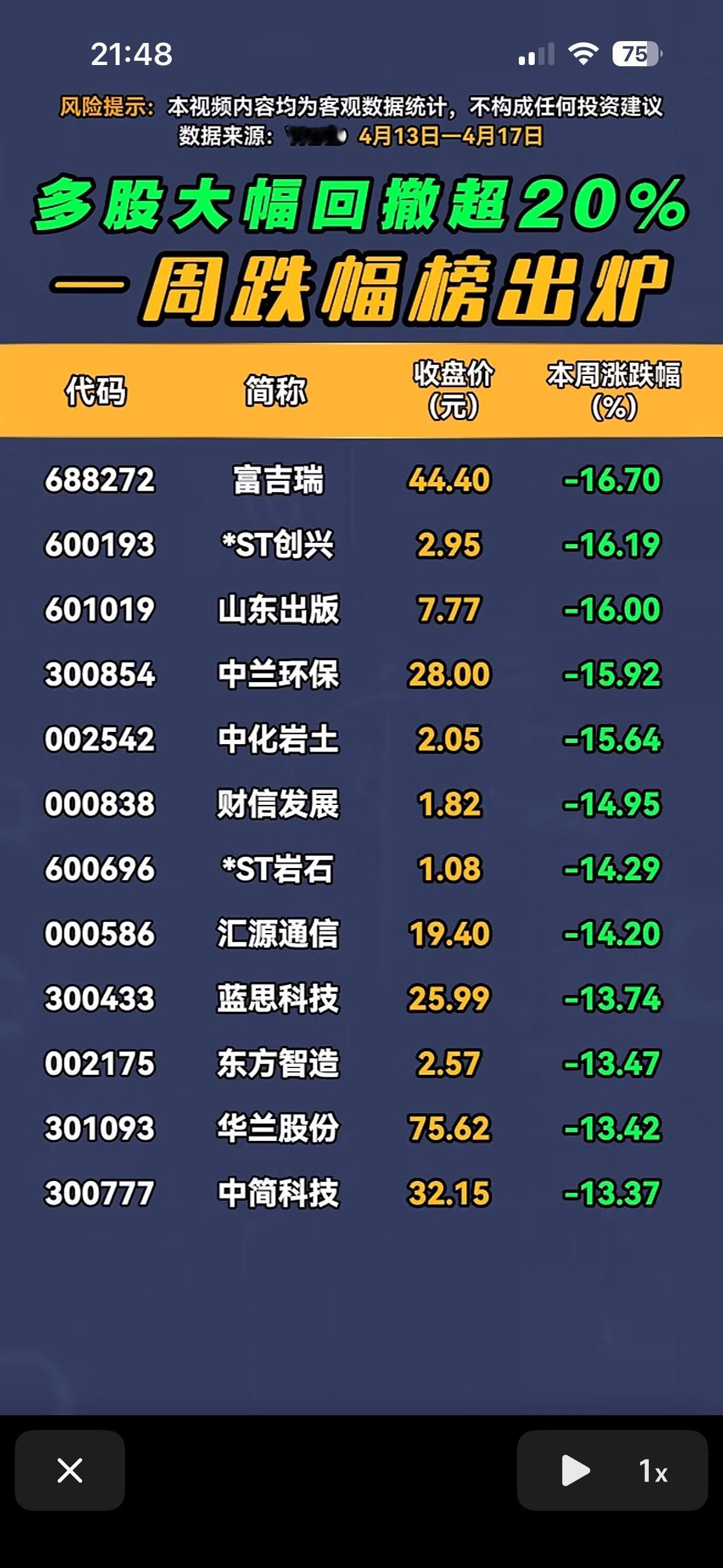 4月13日到17日的股市周跌幅榜出来啦,好多股民估计心都凉透了。榜单里不少股票大跌超20%,这跌势简直让人怀疑人生。就像有些曾经的热门股,之前涨势凶猛,可这周却像坐了滑梯一样直线下降。
