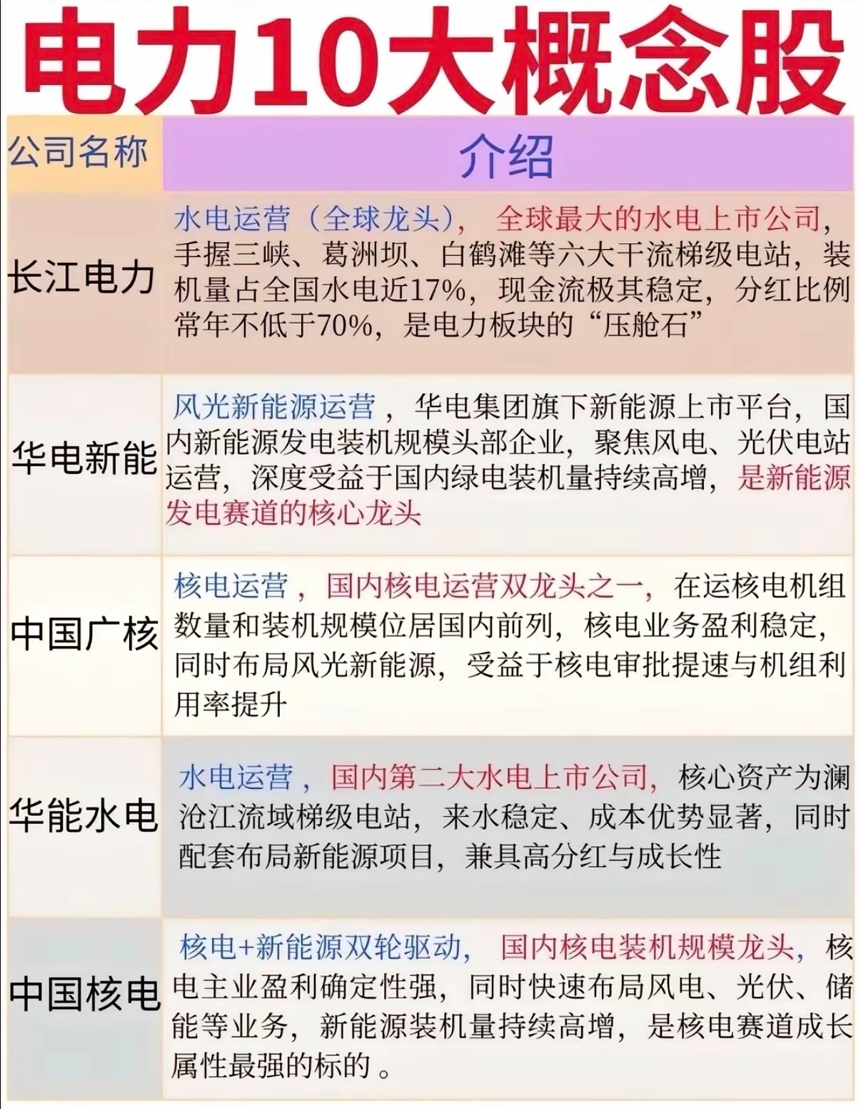 电力10大概念股,绿电概念股持续爆发,华电辽能8连板,晋控电力等十余股涨停。国证绿色电力指数涨2.82%,韶能股份等涨停。1 - 2月全社会用电量同比增6.1%,多领域用电增速显著,绿色电力需求端动能增强。从电力先行概念看,长江电力是全球最大水电上市公司,现金流强、分红稳定,受益于“西电东送”;三峡水利依托三峡集团,“配售电 +”模式有先发优势。华能国际作为火电巨头积极转型。中东冲突强化能源安全诉求,AI算力爆发也重构电力系统价值。不过理财有风险,投资这些概念股得谨慎!