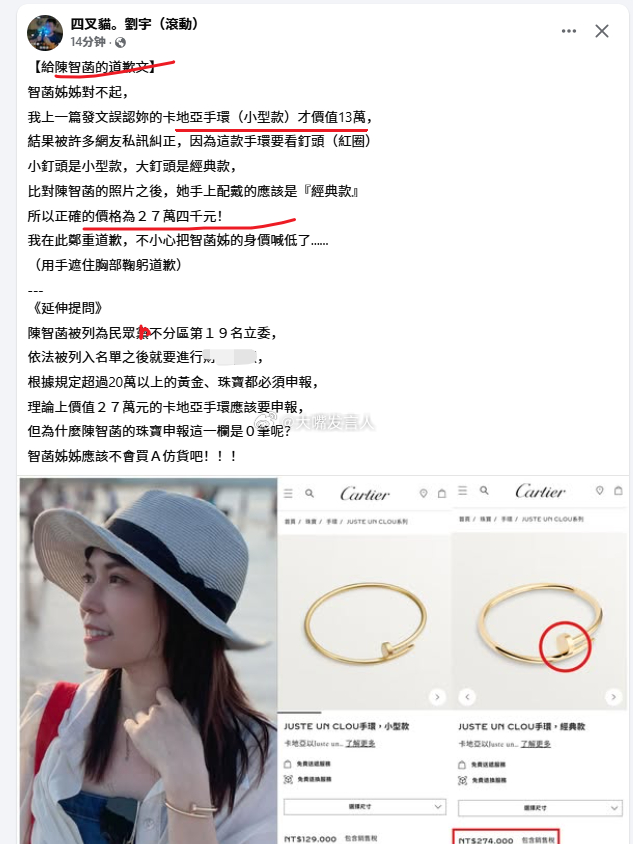 这可能是陆配李贞秀看不上陈智菡的原因之一柯文哲率领的湾湾省的白色阵营,自称小档、没有钱,经常号召粉丝小草们小额捐助,结果柯夫妇不仅看超亿元的豪宅,多次去富商的豪宅欢乐,还有柯的亲信陈智菡,被经常看柯不顺眼的四叉猫盯上,曝光手上饰品超27万元新抬币,合人民币6万多元陈智菡是谁?就是图2中这只骂过大陆的蛙蛙