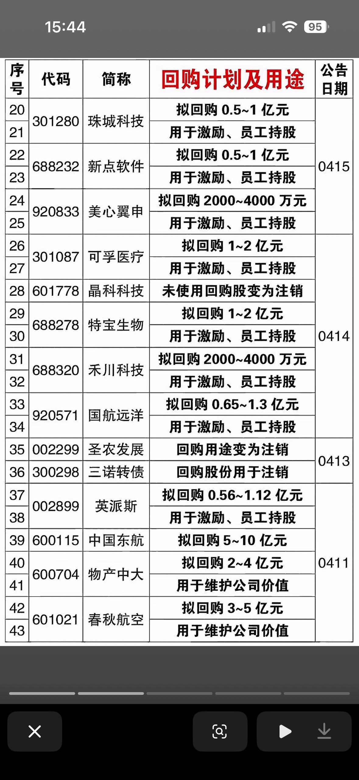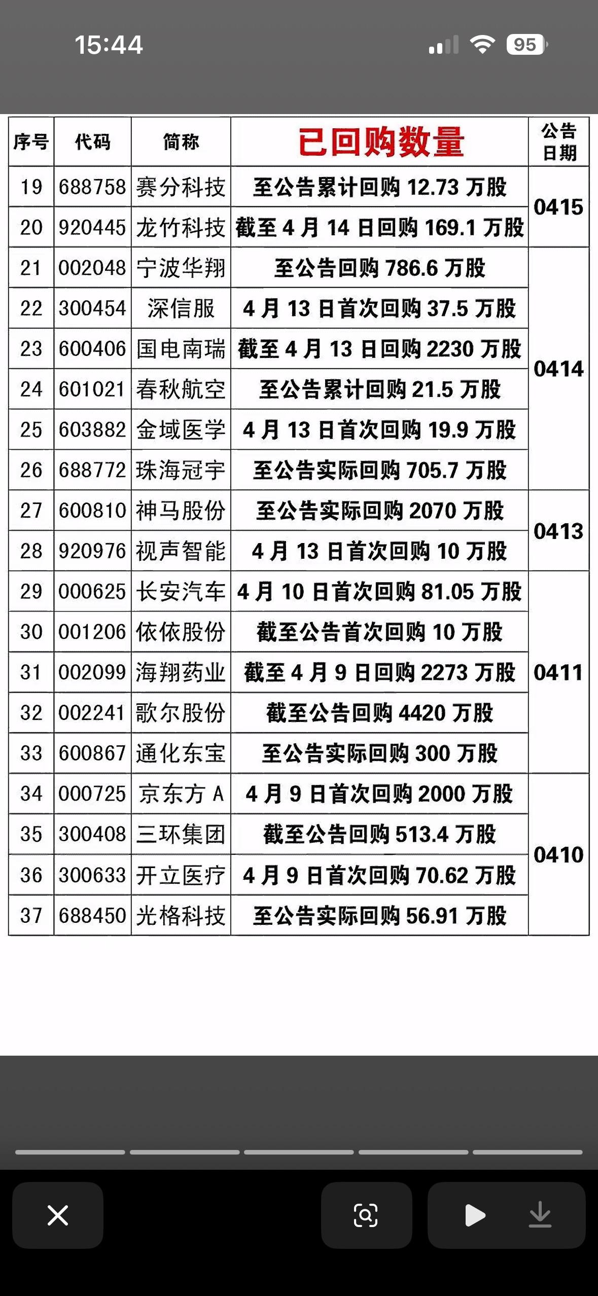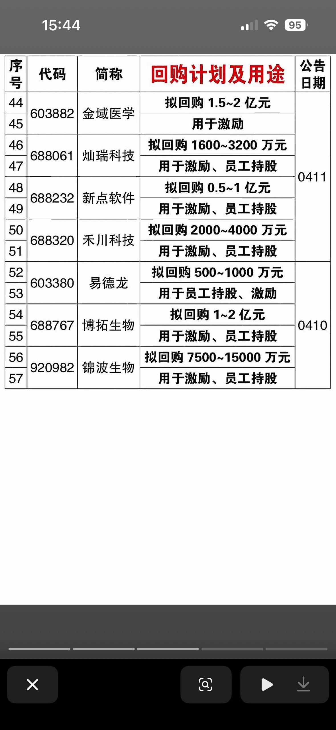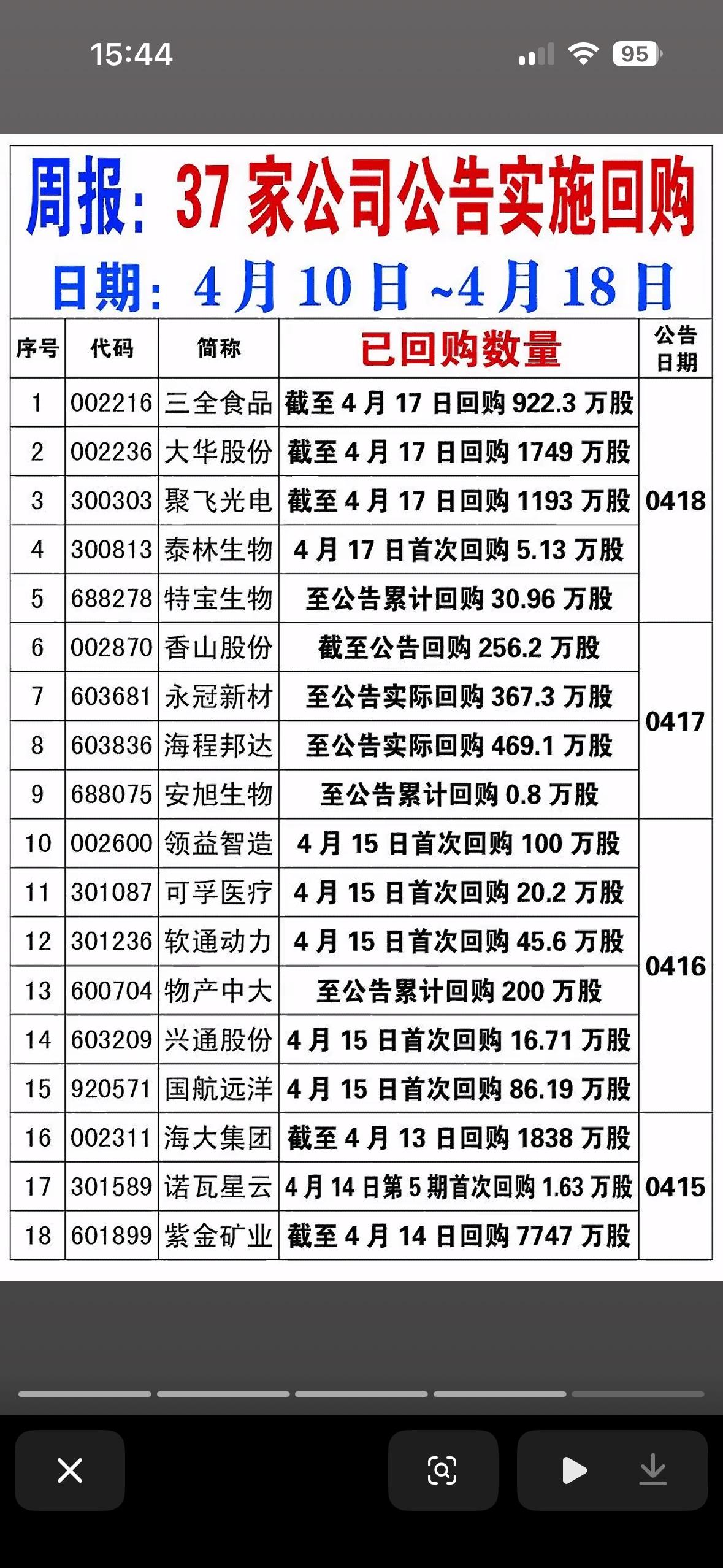 本周有37家公司发布回购公告,这里说说安旭生物和海南矿业。安旭生物于4月16日首次回购8000股,占总股本0.0063%,回购价在38.86 - 38.87元/股,已花310938.39元,预计回购2500万 - 4900万元,用于员工持股或激励,期限到2027年3月29日。截至4月17日收盘,其股价较上周跌0.49%,市值48.94亿元。