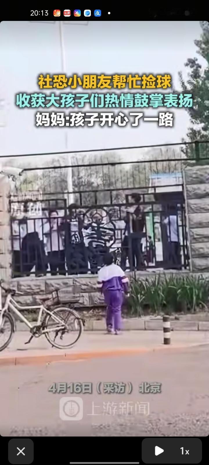 4月15日,北京。网友发视频称,一位社恐小朋友帮忙捡球,受到学生们热情鼓掌表扬。