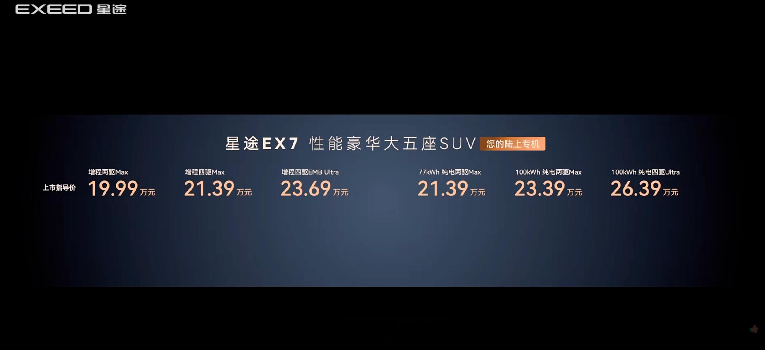 奇瑞星途 EX7 正式上市了,售价 19.99-26.39 万元,这是一款大五座 SUV,比同家族的 ET5要再大上一圈,全系有增程「可加 92 号汽油」和纯电两种动力形式可选,共计 6 个配置:
