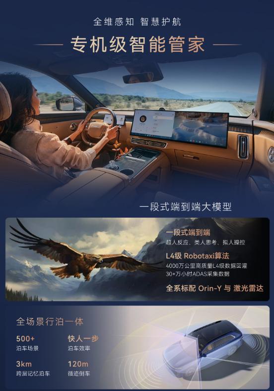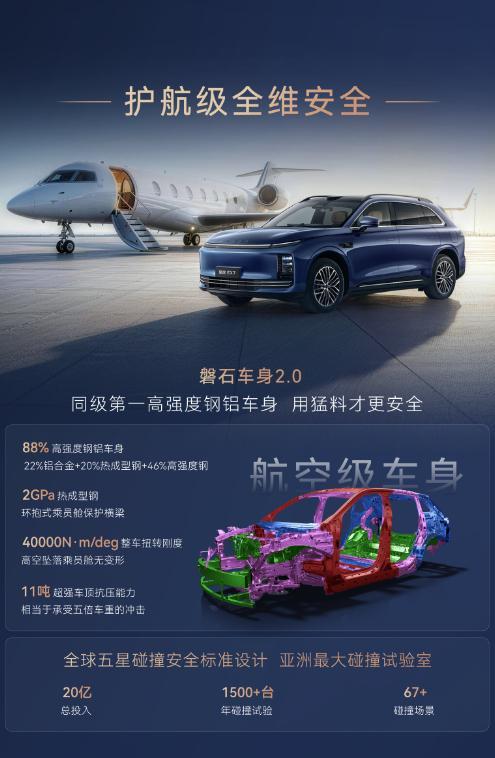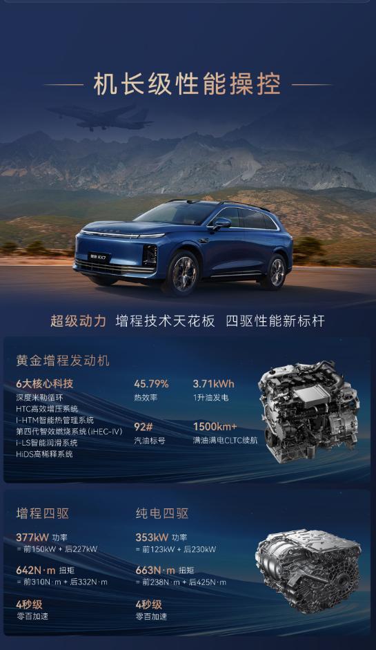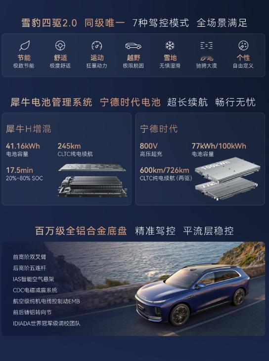 全球首搭航空级EMB线控制动,刹车更快更稳;飞鱼底盘3.0+CDC电磁减振,舒适性提升。增程版综合续航超1500km,馈电油耗百公里5.8L;纯电版800V平台,11.5分钟快充可从5%充至80%。全系还标配猎鹰700智驾+灵犀智舱,30英寸大屏,城市NOA终身免费。