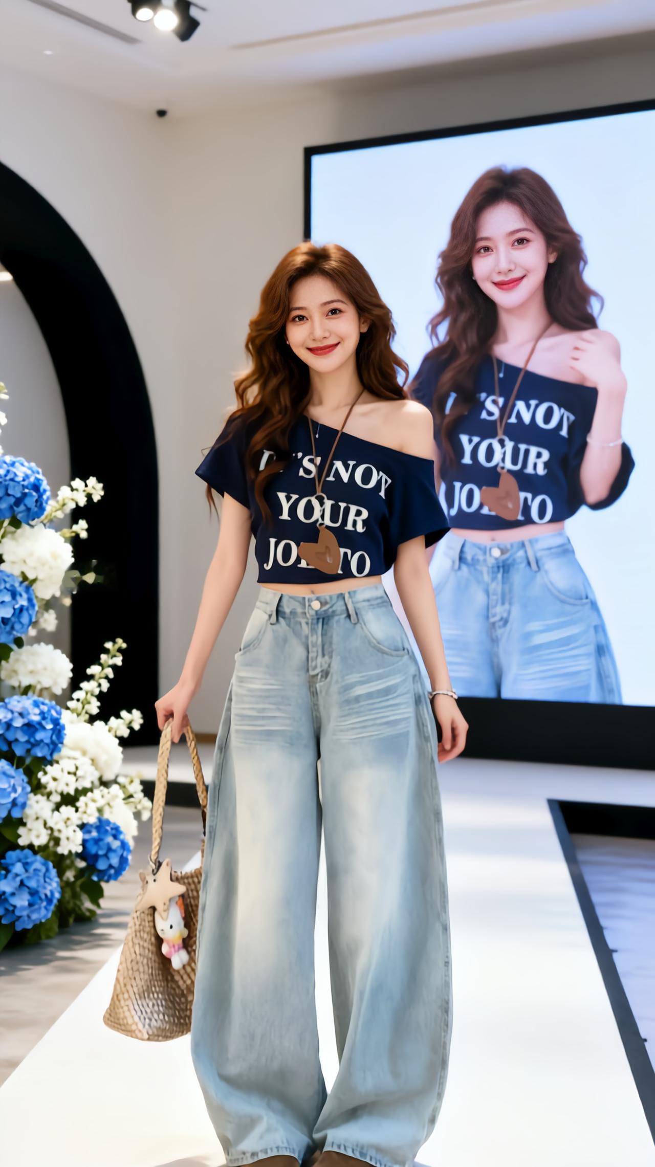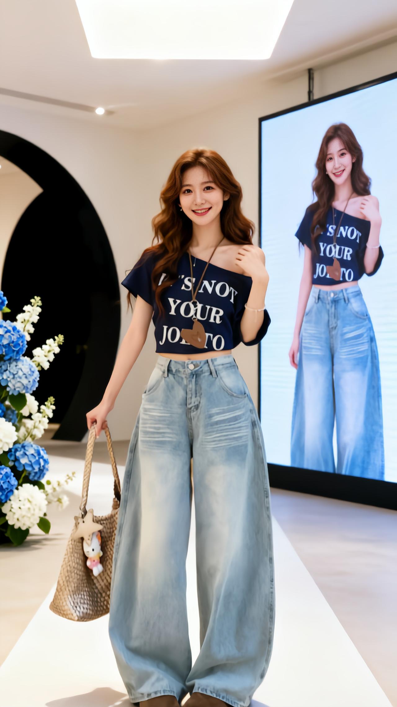 牛仔阔腿裤的百变魅力 一字肩t恤穿搭 阔腿牛仔裤辣妹穿搭 炸裂阔腿牛仔裤 美式小