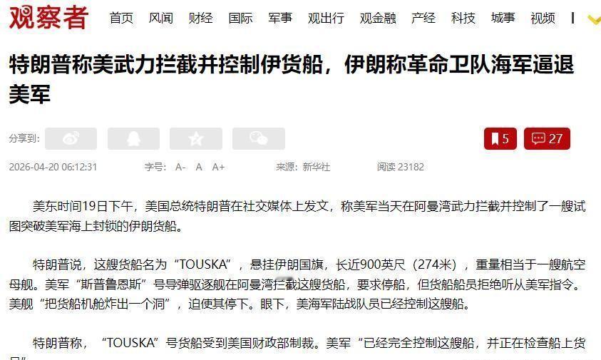 谁能想到,堂堂超级大国,竟然在光天化日之下干起了“拦路抢劫”的买卖!4月19日下午,阿曼湾海域突然炮声大作,一艘满载中国商品的巨轮被当场炸瘫。这不是好莱坞电影里的特效桥段,而是美国海军刚刚上演的真实海盗戏码!