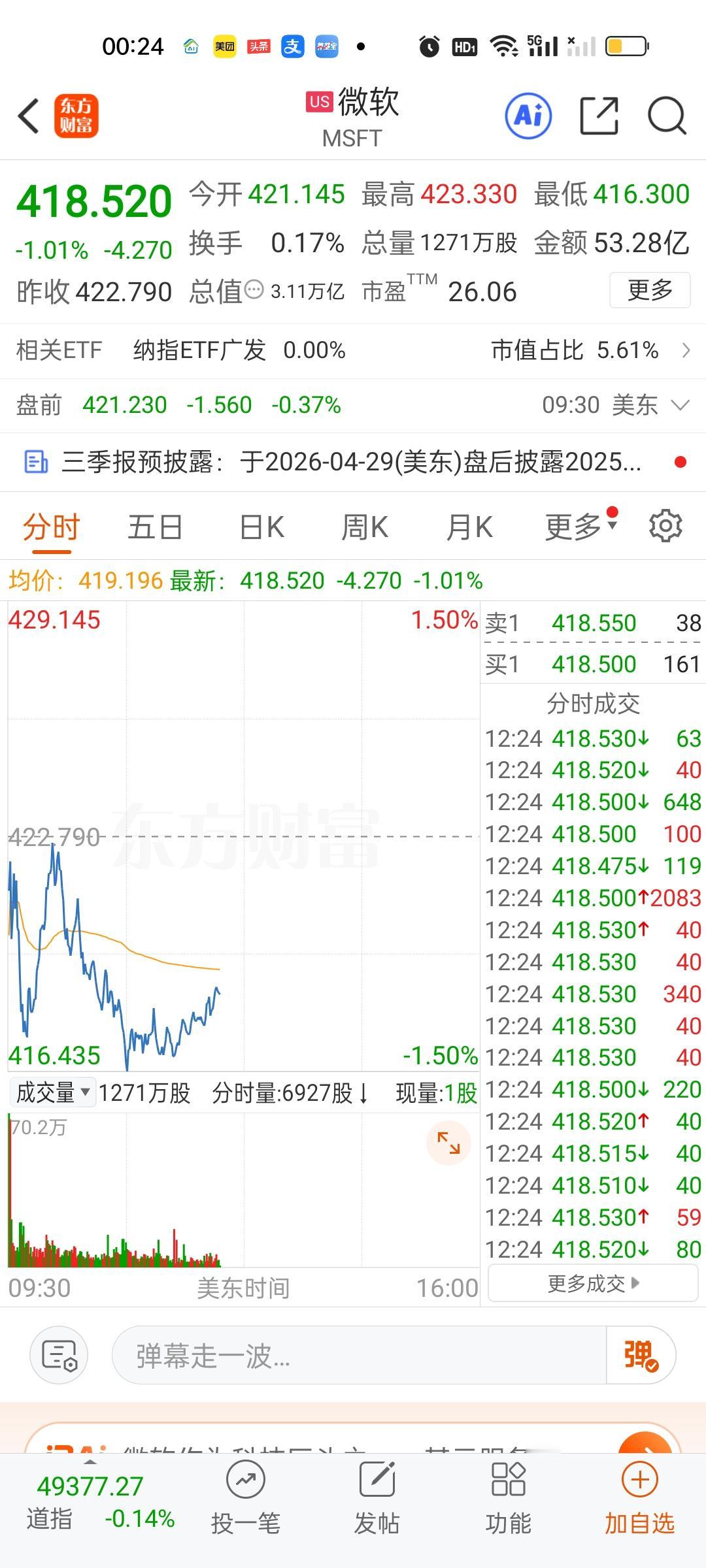 美股三大指数全部在下跌,另外科技股表现都不太好,英特尔,英伟达,特斯拉等表现也很疲软。如果是这样,那明天我们的科技板块也好不到哪里去。科技板块看来要承压了。