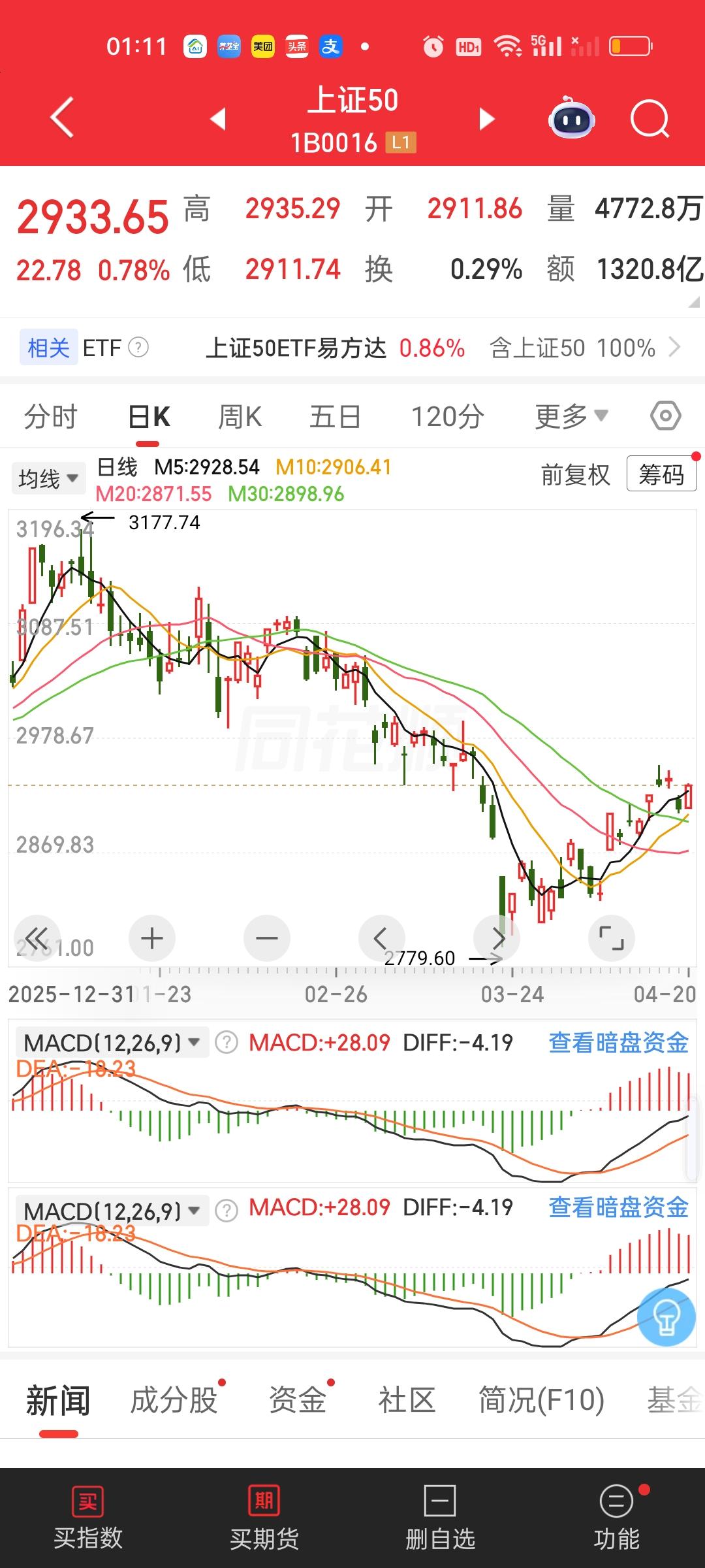 上证50前高3177.74,今天收2933.65,3177.74/2933.65=1.0832,还差8.32%。