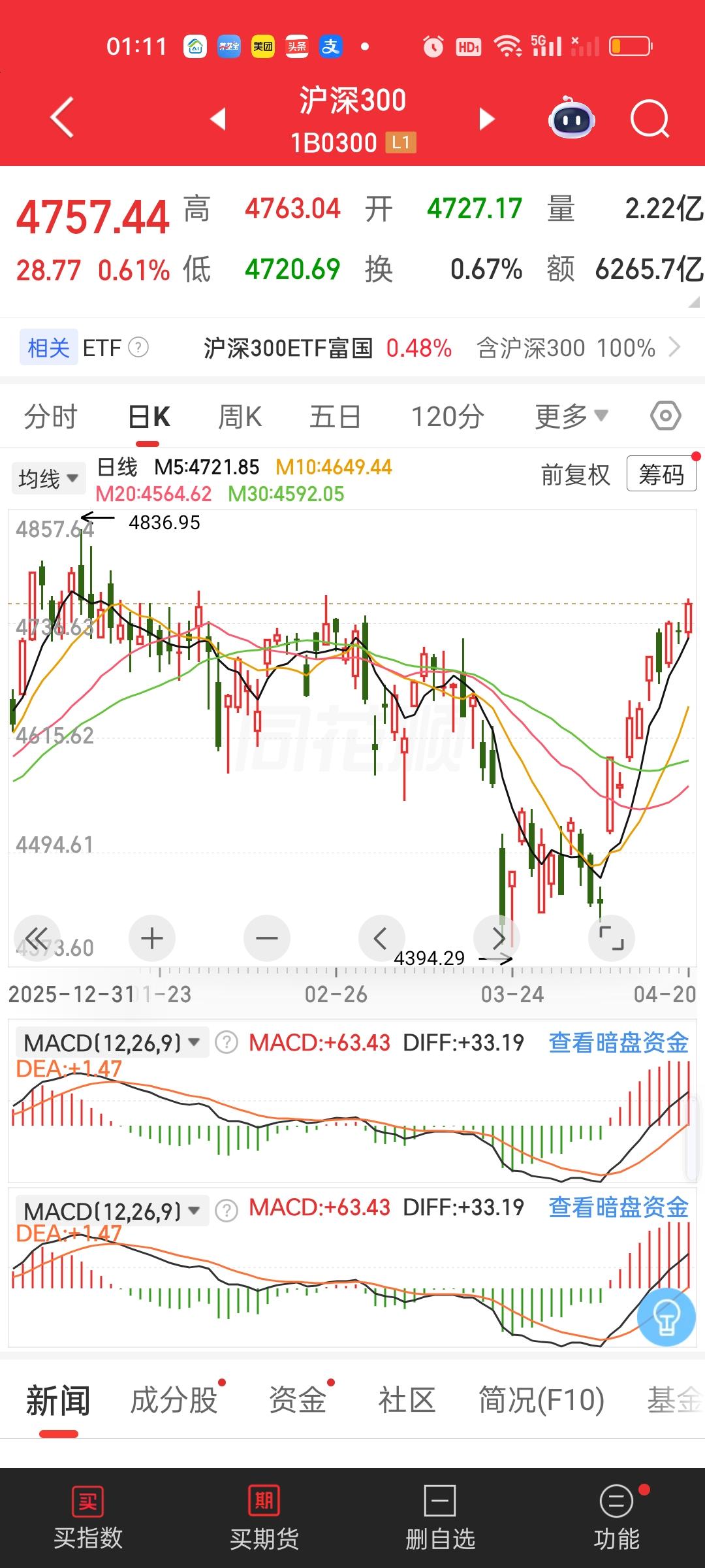 沪深300前高4836.95,今天收盘4757.44,4836.95/4757.44=1.0167,还差1.67%创新高。