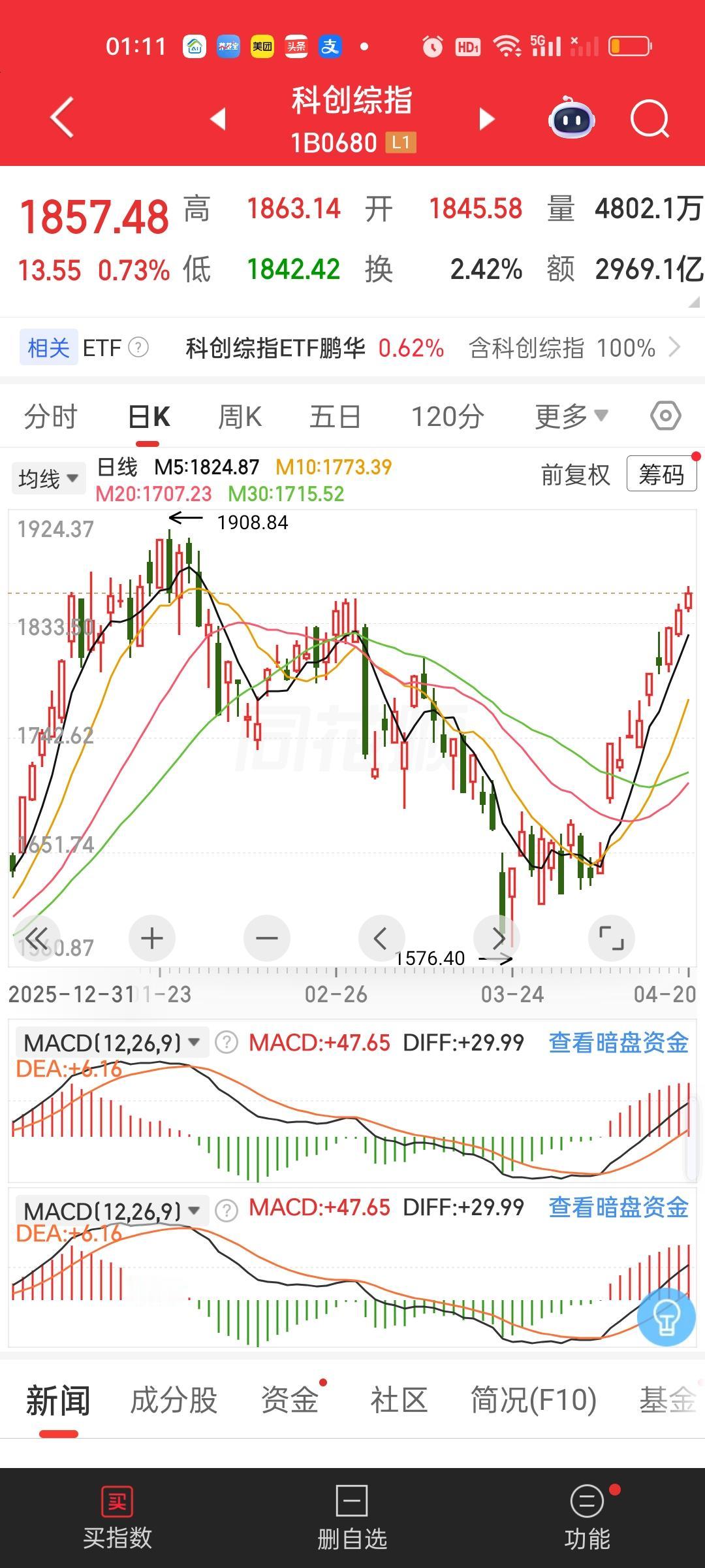 科创综指前高1908.84,今天收盘1857.48,1908.84/1857.48=1.0276,还差2.76%创新高。