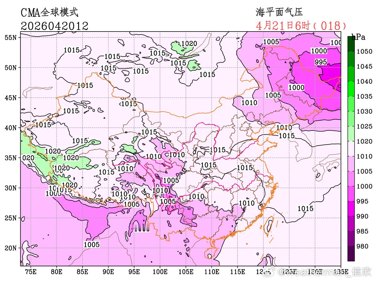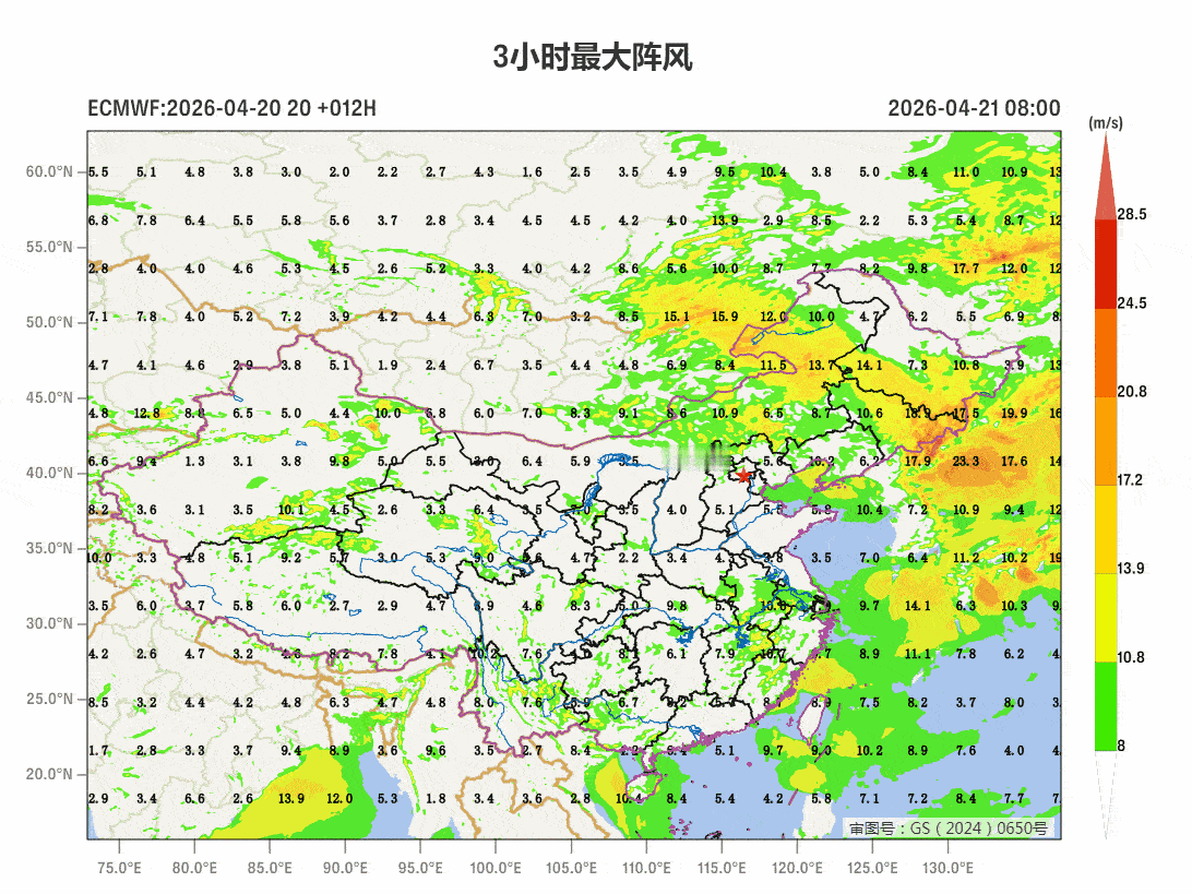 图2为逐3小时阵风预报,可见今天东北地区以及青藏高原一带的大风,有明显的日变化特征,白天尤其是中午-下午强,到了晚间明显减弱。从天气形势看,气压场上没有很大的落差(气压梯度不是很强),但因为有动量下传作用,白天光照加热,使得垂直方向上有能量交换,把高空动量传导到地面,导致大风。