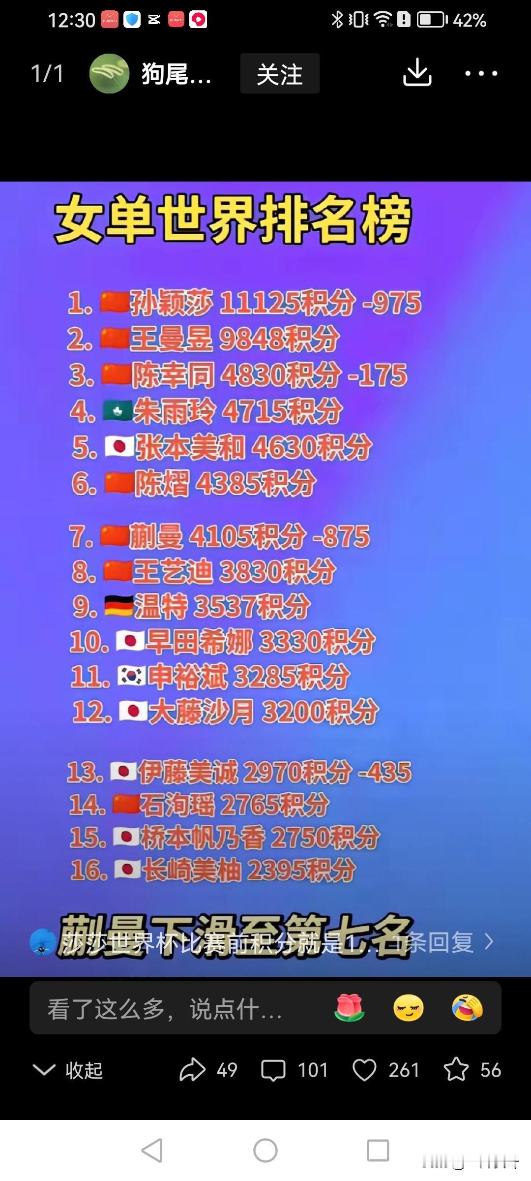 乒乓球女单最新排名出炉了!虽然,孙颖莎被扣除了975分,她依然以11125分占据榜首。