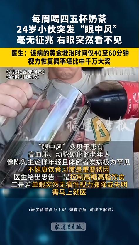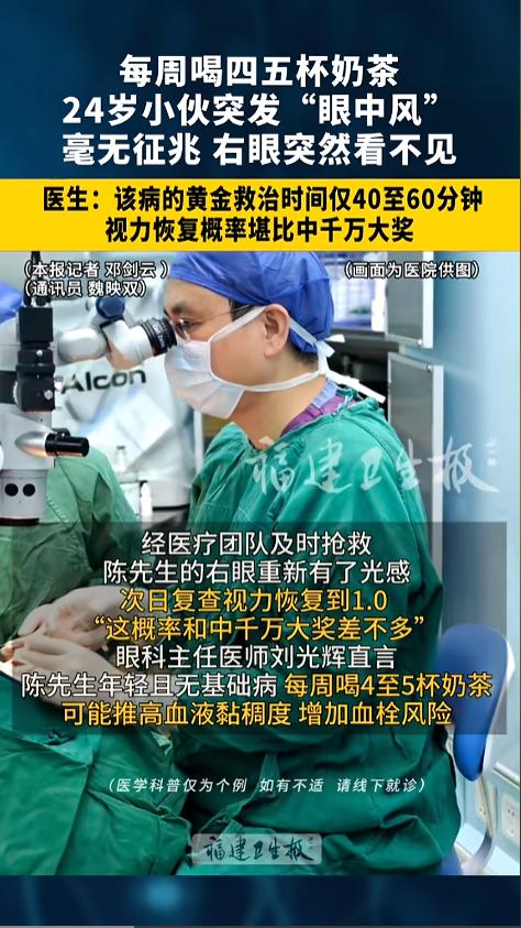 信息来源:《每周喝四五杯奶茶 ,福建 福州24岁小伙突发“ 眼中风 ”,毫无征兆 右边眼睛突然看不见,医生:该病的黄金救治时间仅40至60分钟