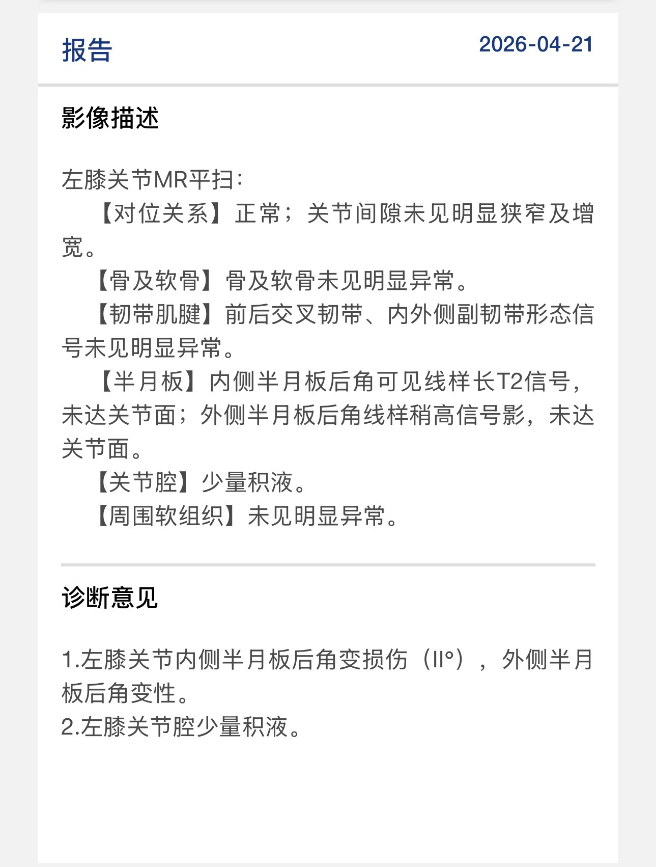 昨天做的核磁报告结果出来了,问题不大,给医生看过了,休息一段时间就行,减少运动量