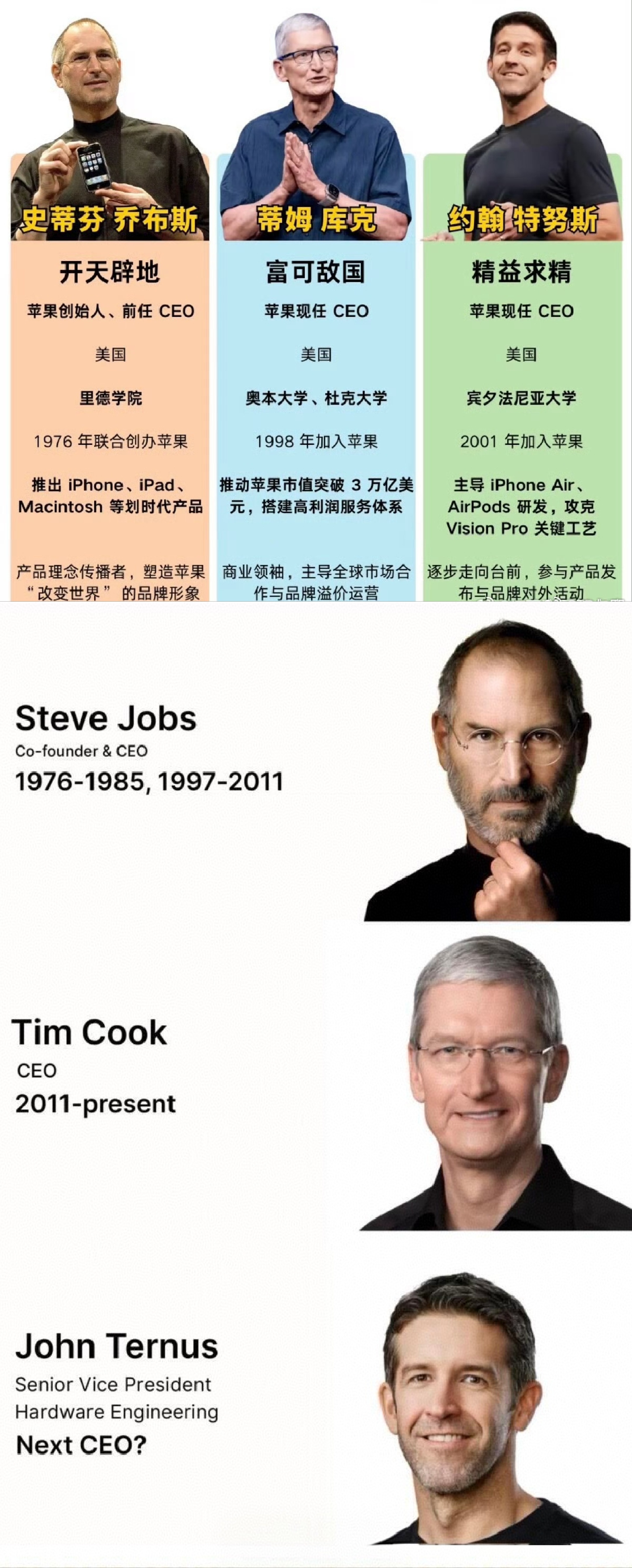 51岁的接班人特努斯,曾主导M芯片、iPhone、Mac,擅长产品突破,加之性格上的果断强势,被苹果认为适合公司AI布局及硬件换代的技术型CEO,后续苹果或许会有创新突破的产品。苹果更换ceo原因首次曝光