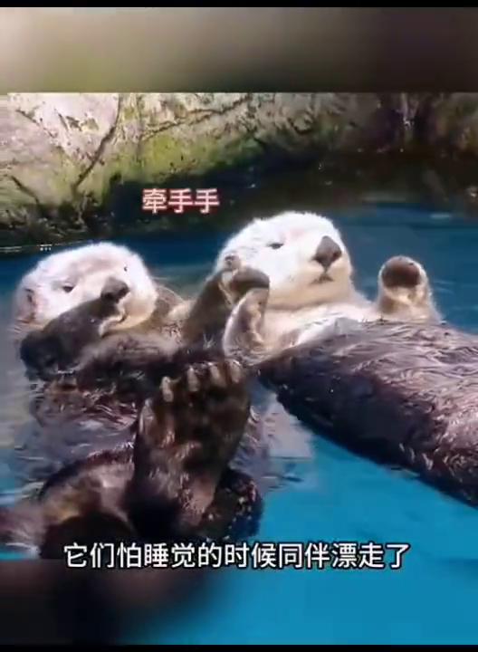 这胳肢窝这么能装东西,我以为它有兜,结果是身上肉太多,放在肉的夹层了。你别看海獭肉嘟嘟的,其实它们睡觉都是漂在水上的。它们怕睡觉的时候同伴漂走了,所以都是牵手睡觉的,毕竟一起丢等于没丢。
