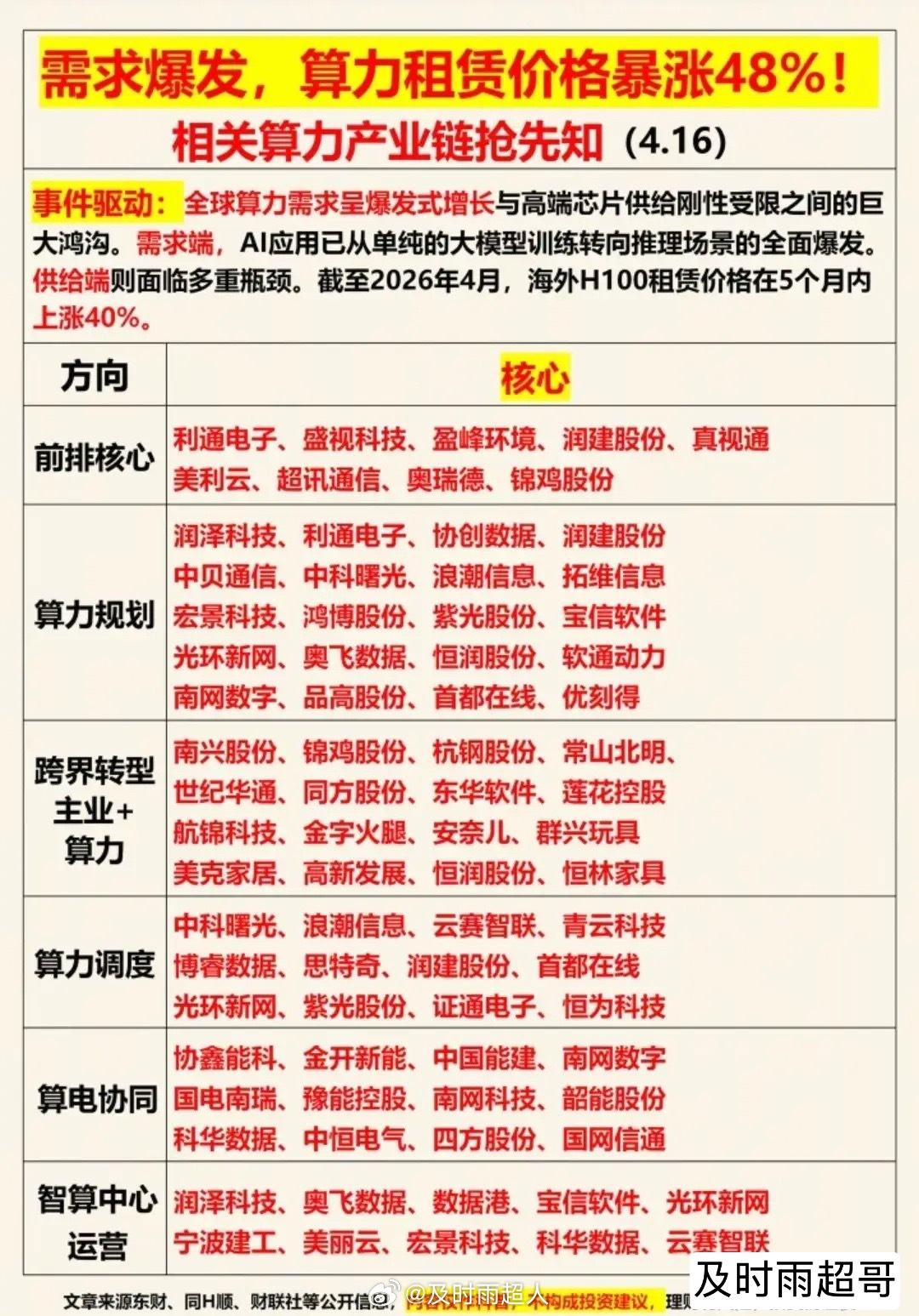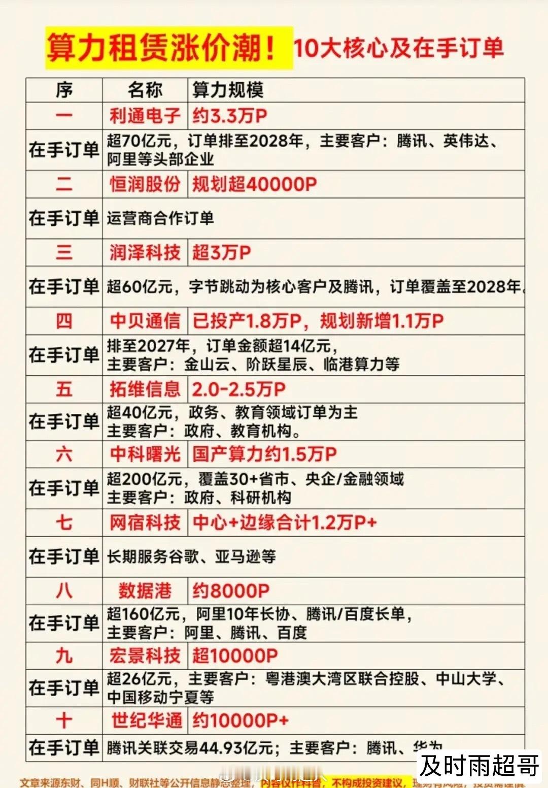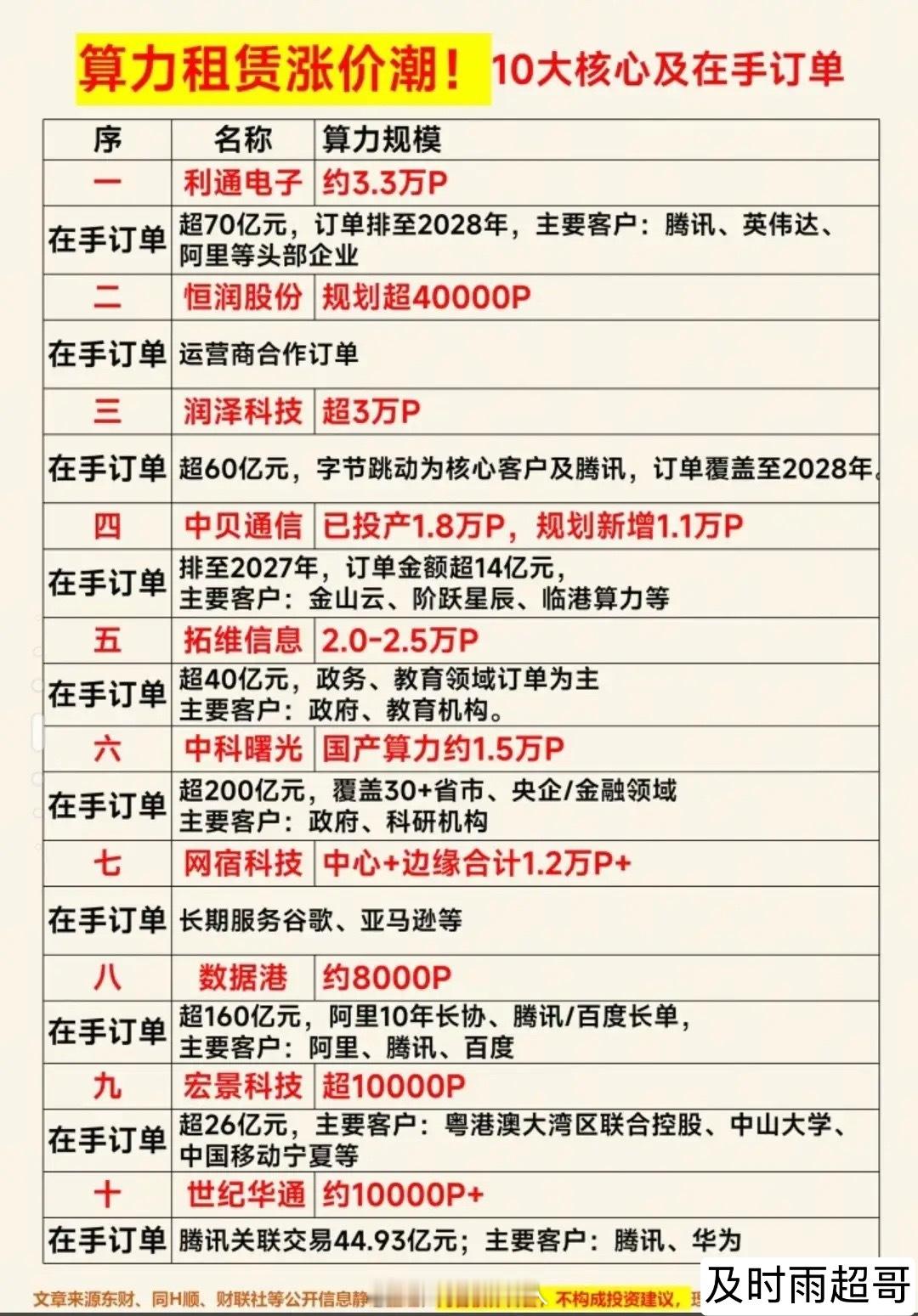 AI算力抢疯了!价格暴涨48%,订单排到2028年,算力租赁规模龙头代表有哪些!?算力租赁涨价潮席卷全球!日均词元调用量突破140万亿,同比增长超40%,国内外算力荒愈演愈烈,阿里云四天连发三条涨价公告,海外H100租赁价格5个月内暴涨40%,供需缺口推动算力租赁价格最高暴涨48%。从核心标的来看,利通电子、润泽科技等头部企业手握超70亿、超60亿订单,订单已排至2028年,算力规模与在手订单双高,同时算力规划、跨界转型、算电协同等全产业链标的同步受益,算力租赁正成为AI时代最具确定性的主线之一。(免责声明:以上内容仅为市场信息梳理,不构成任何投资建议,理财有风险,投资需谨慎)