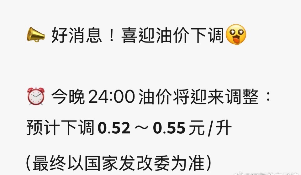 加油 好消息来了!根据国家发改委的正式通知,就在今晚(4月21日)24时,国内成品油价格将迎来2026年的首次下调 。油价油价降了 📉 为什么这次会降价?