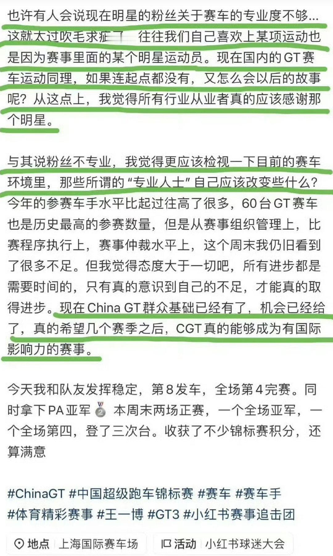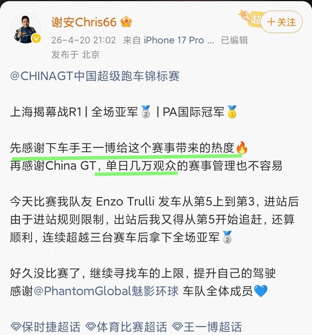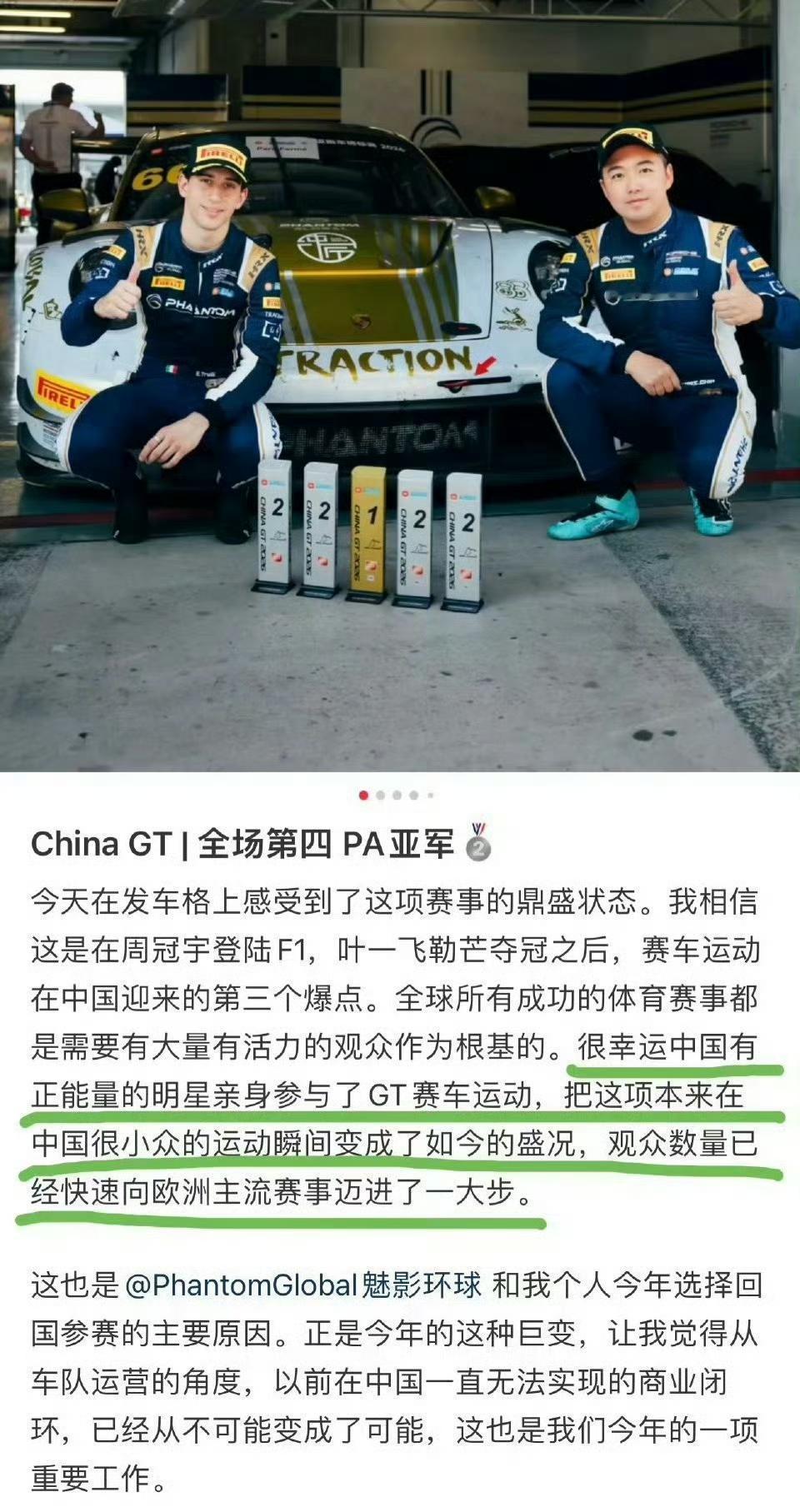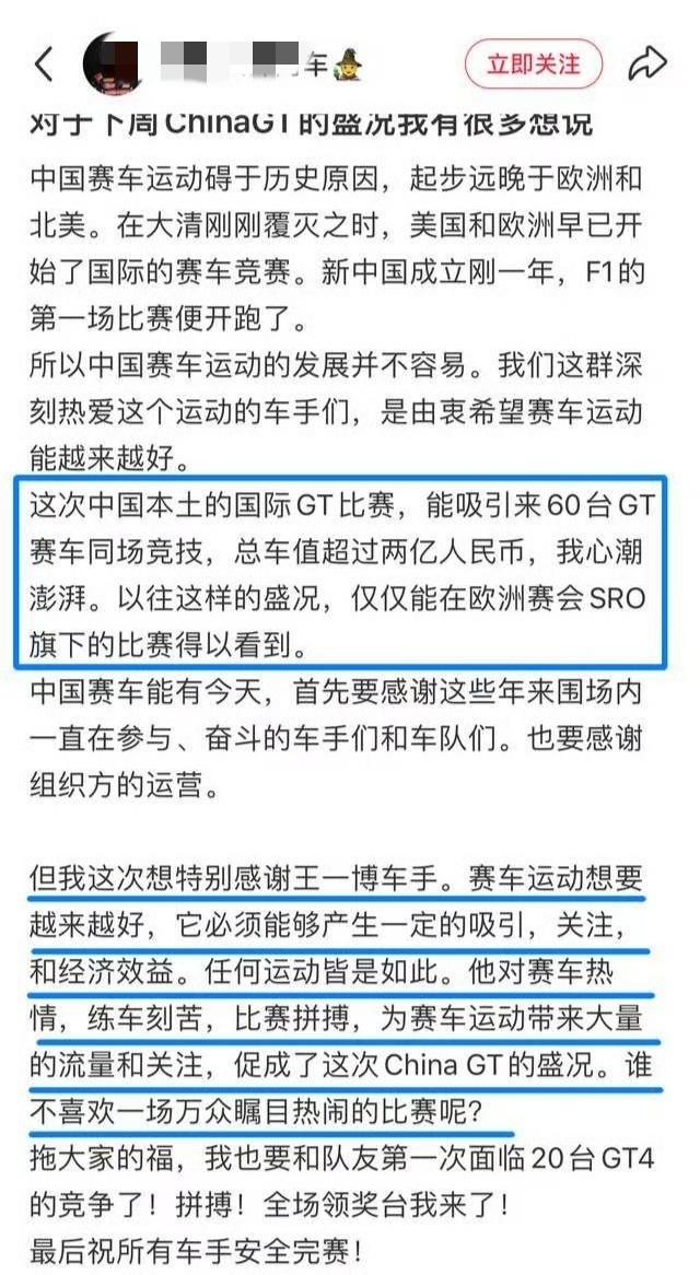 解说直言“他几乎是以一己之力,整体拉升了ChinaGT的观赛规模和参赛规模”,直接把“王一博把ChinaGT干成了全球顶级赛事”送上热搜!