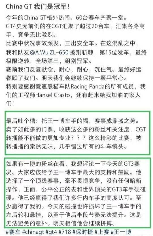 冠军车手更是表达了对车手王一博的尊重——“他选择了一个顶级赛事,毫不畏惧竞争,没有任何暗箱操作,正面、公平公正的去和世界顶尖的GT3车手硬碰硬。他已经赢得了我们许多行内车手的高度认可,至少赢得了我的。”