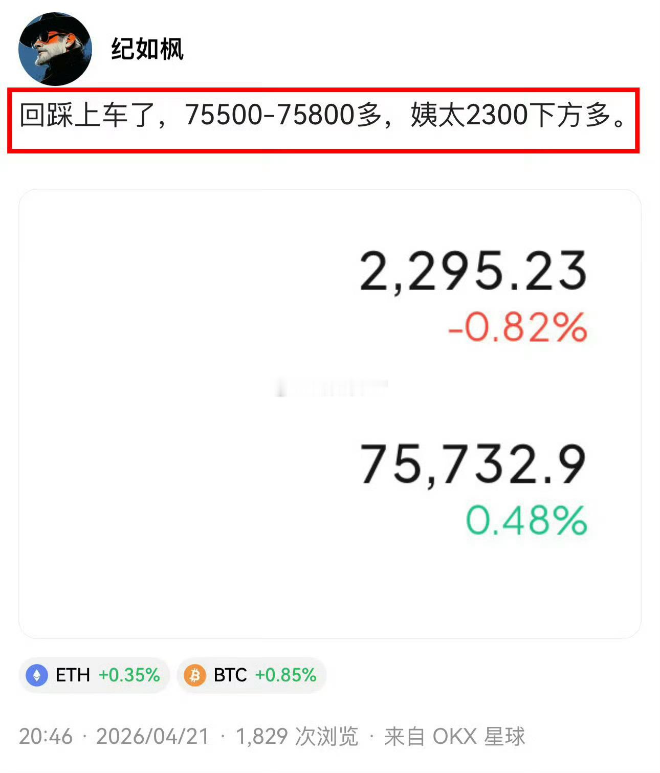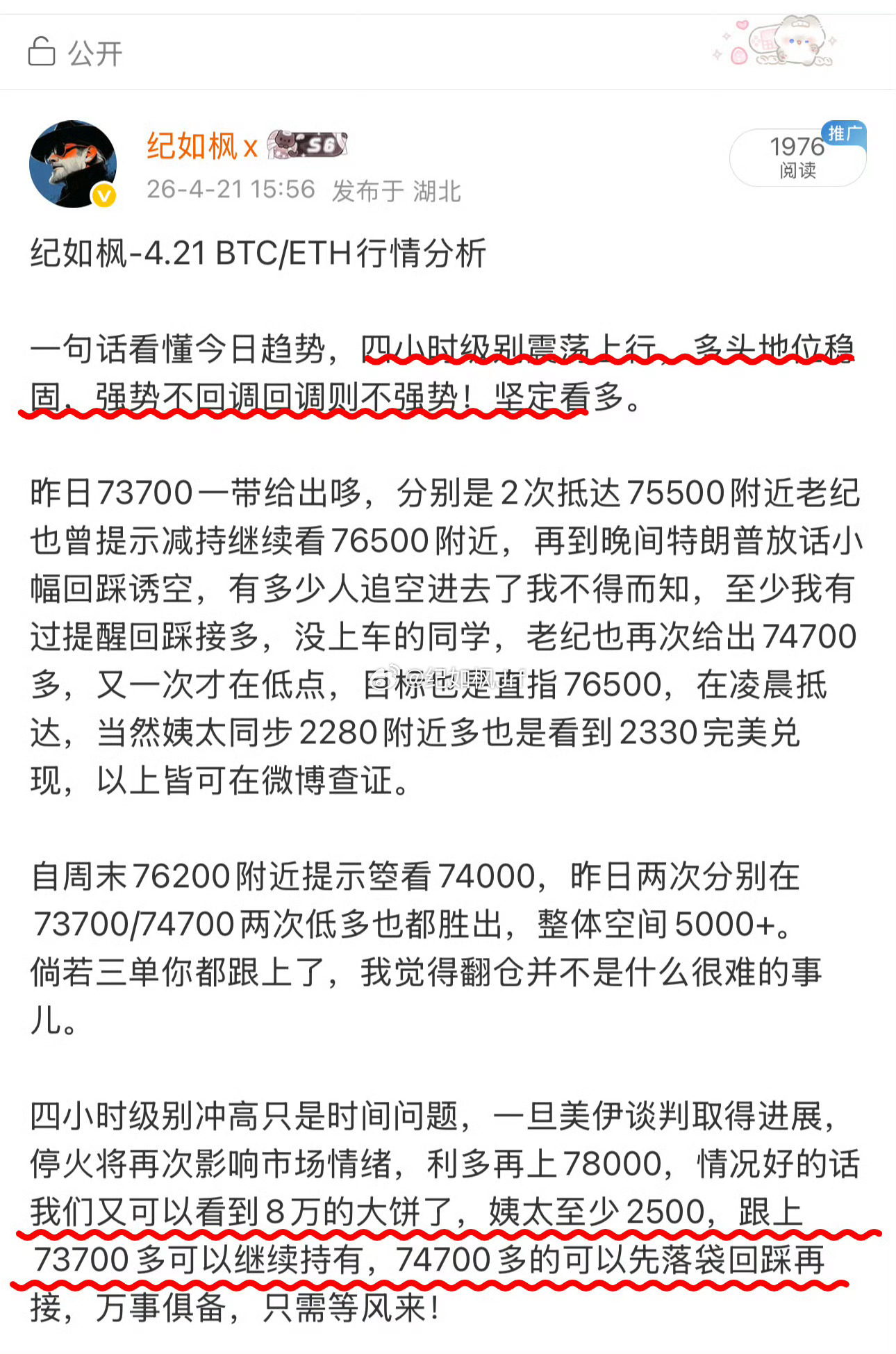 昨晚也提示注意姨太补涨看2400附近,73700的多也说了至少看到78000-80000,姨太同步2400,舒服。
