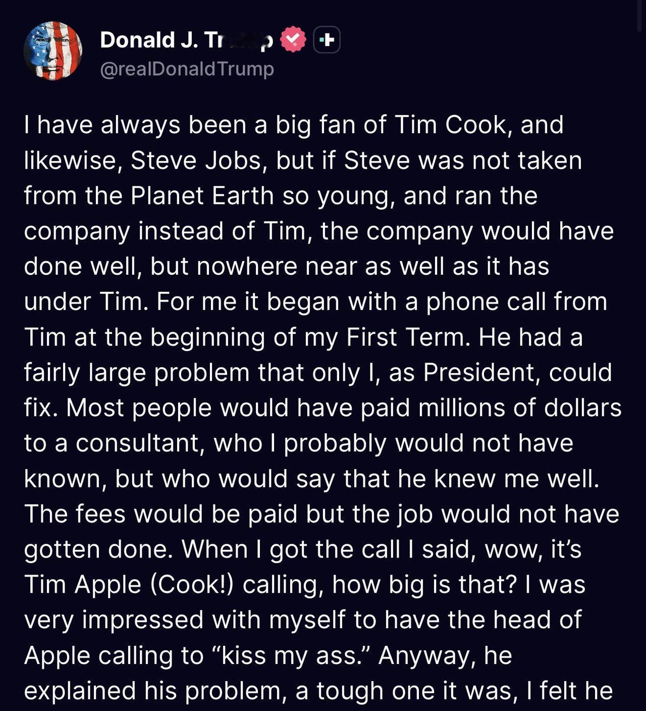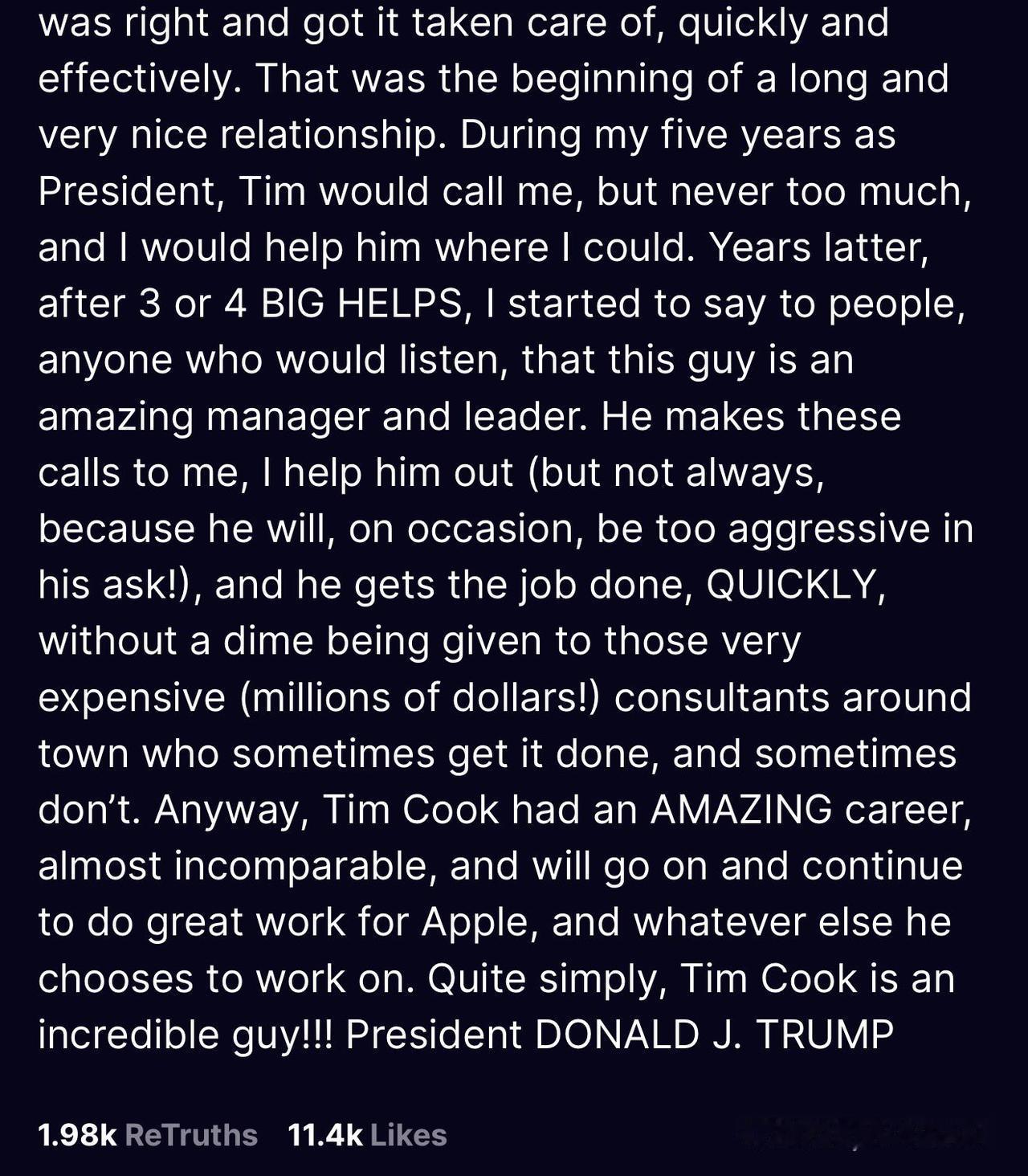 库克辞苹果CEO,特朗普发长文“致敬”库克。