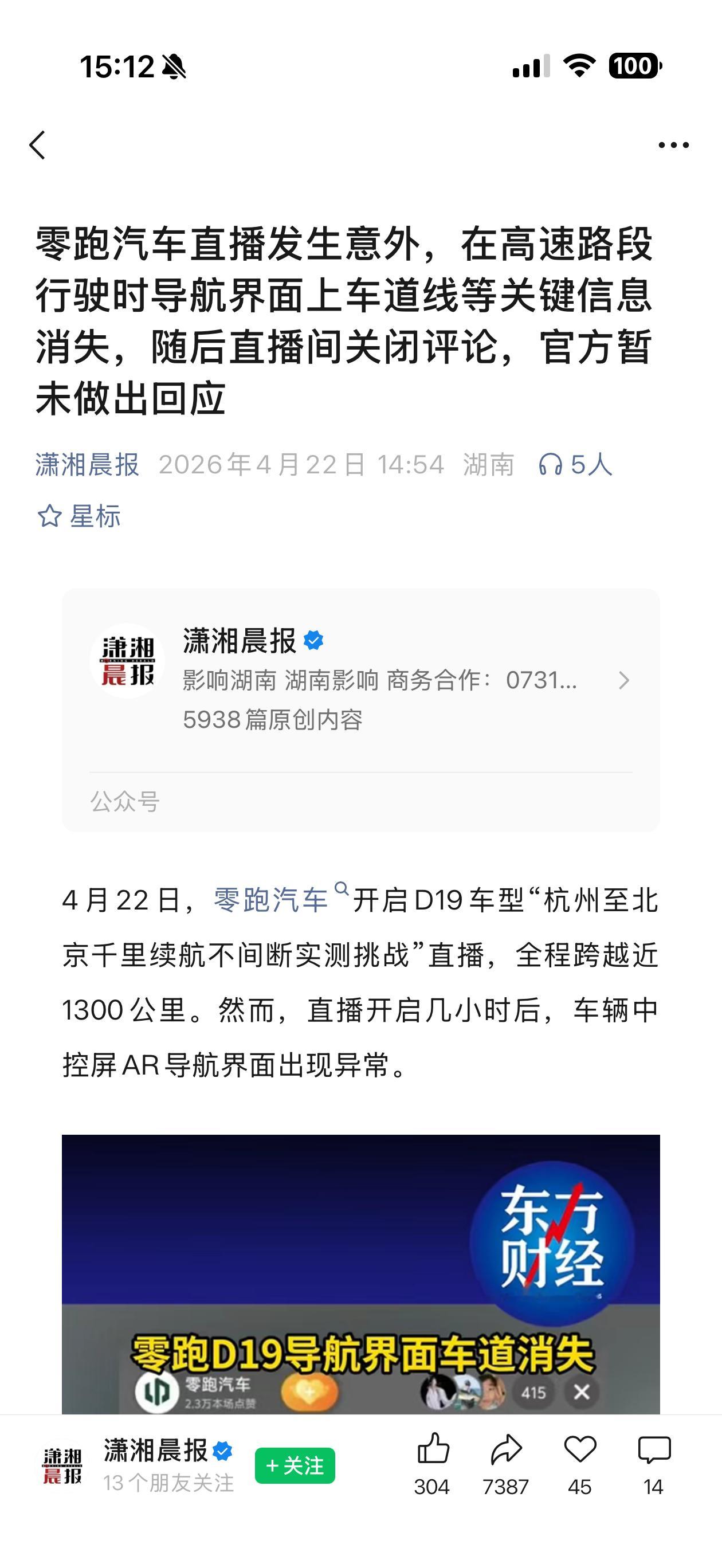 零跑汽车关闭直播弹幕零跑D19导航界面车道消失………D19的硬件配置是绝对没问题