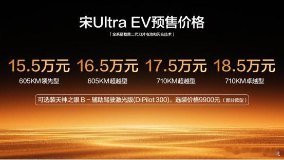 先说说大家最关心的价格和配置,这次宋 Ultra EV 一共出了四款车,605km 续航的两款分别是 15.5 万和 16.5 万,710km 长续航的两款 17.5 万和 18.5 万,这个价格区间卡在主流紧凑型和中型纯电 SUV 之间,但是配置直接越级。而且部分款型还能选装天神之眼 B - 辅助驾驶激光版,才 9900 块,对比同级别的高阶智驾选装价,这个性价比真的没话说。