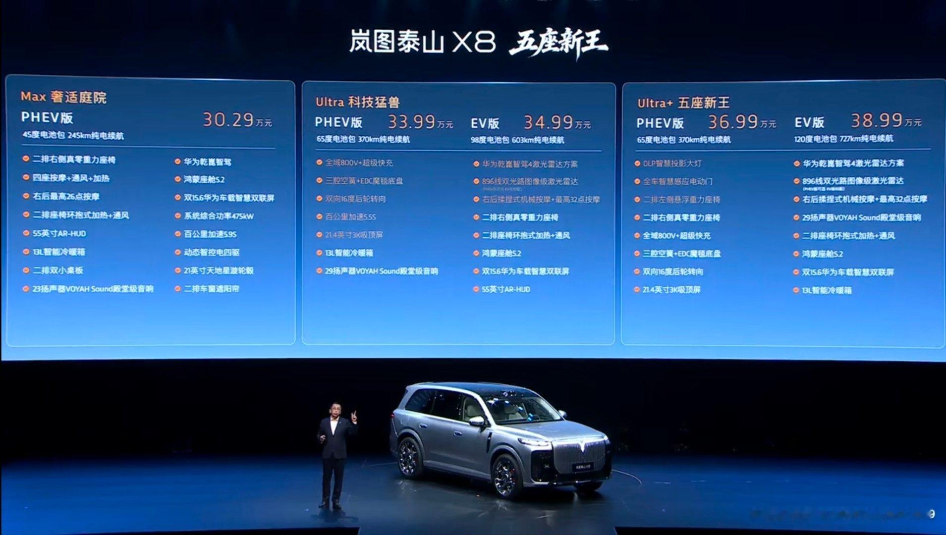 30.29万 Max版245km/45度电/动态电四驱/零百5.9S/21寸轮毂华为乾崑智驾/鸿蒙座舱/双15.6寸智慧双联屏/55寸AR-HUD真皮座椅/前后座椅电调+通风+加热+按摩/二排右侧零重力座椅/二排小桌板+遮阳帘/23扬声器33.99万 Ultra 智能超混版370km/65度电/800V/零百5.5S三腔空簧+EDC魔毯底盘/双向6度后轮转向四激光雷达+可选896线激光/21.4寸二排吸顶屏/29扬声器右后机械按摩/13L冷暖冰箱34.99万 Ultra 智能纯电版603km/98度电/896线激光雷达36.99万 Ultra+智能超混版370km/65度电可选896线激光雷达DLP投影大灯/全车感应电动门/二排双零重力座椅38.99万 Ultra+智能纯电版727km/120度电896线激光雷达其他2000-5000折扣教授觉得以30万起步的价格,35中左右就能享受到ADS4+896线激光雷达也不错。对比其他的8系还是有一定的优势的,顶配的话给的也足够多了,双零重力,800V,896线激光雷达,性能也很强,打其他8系的话,也是毫不逊色的,你们觉得呢?