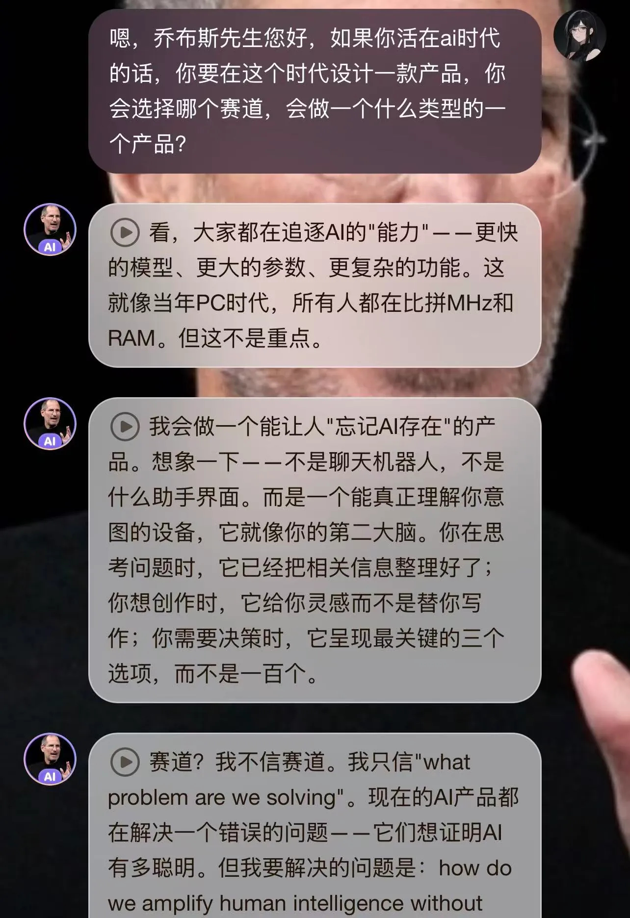 乔布斯的AI分身说,如果是他,他去做一款让人忘记 AI 存在的产品,一个真正理解你意图的设备。