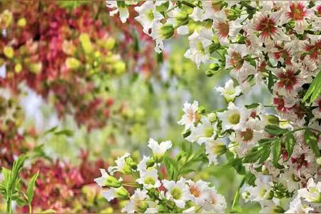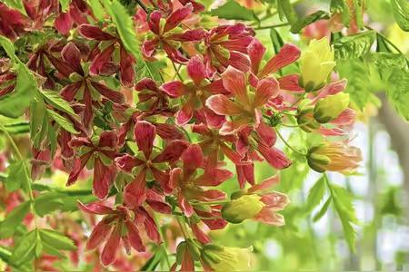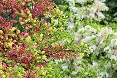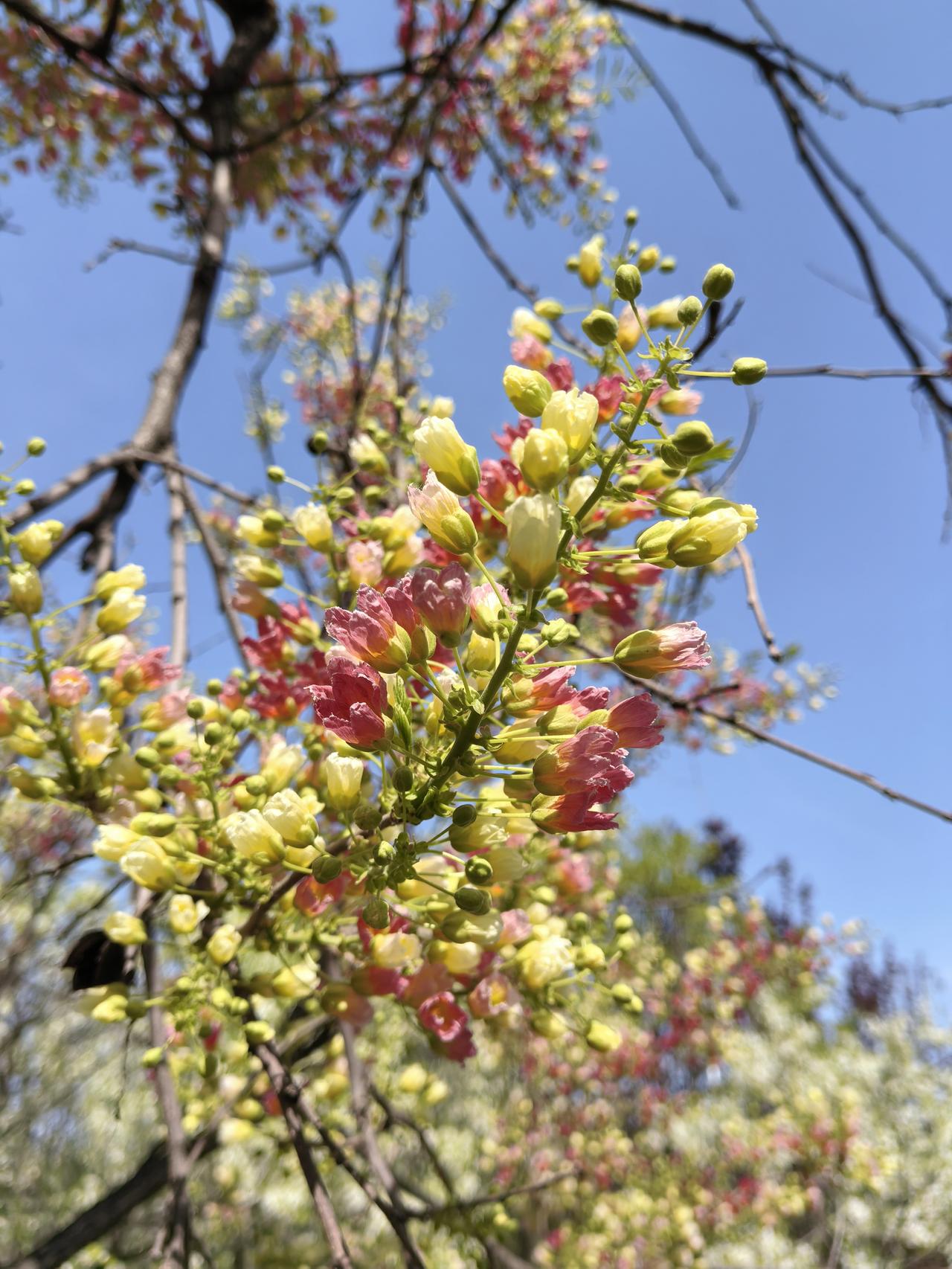 三色同株文冠果好看吗? 非常好看!它的美独一无二,同一株树上能同时绽放黄、红、紫三种颜色的花朵,层层渐变,流光溢彩,就像披上了华丽的霞帔,观赏价值极高。 在平谷湿地公园西侧,一种极为罕见的红色文冠果,三色同株流光溢彩,美到失语!