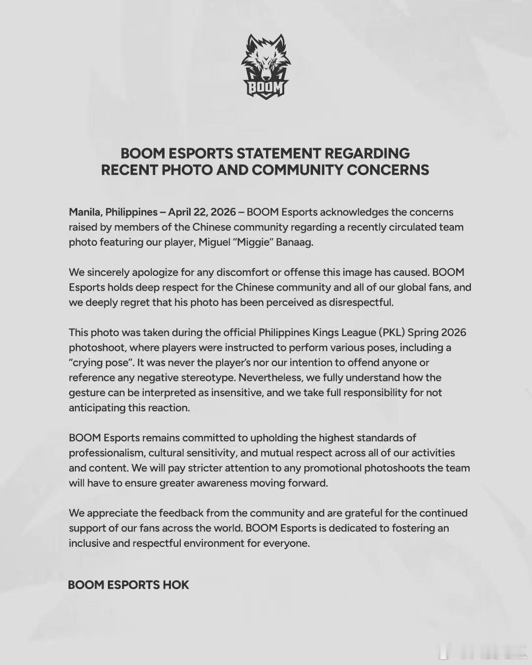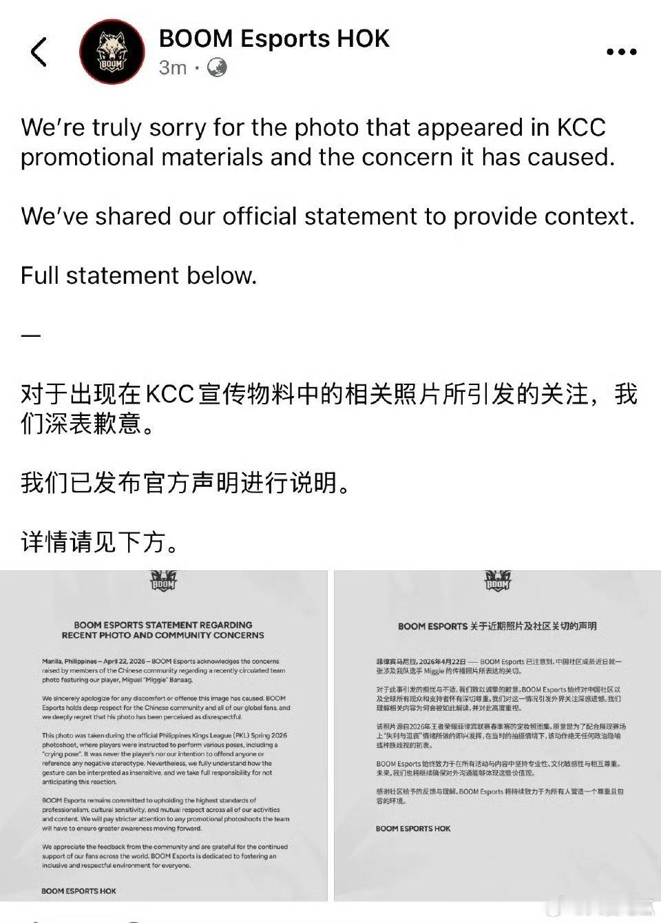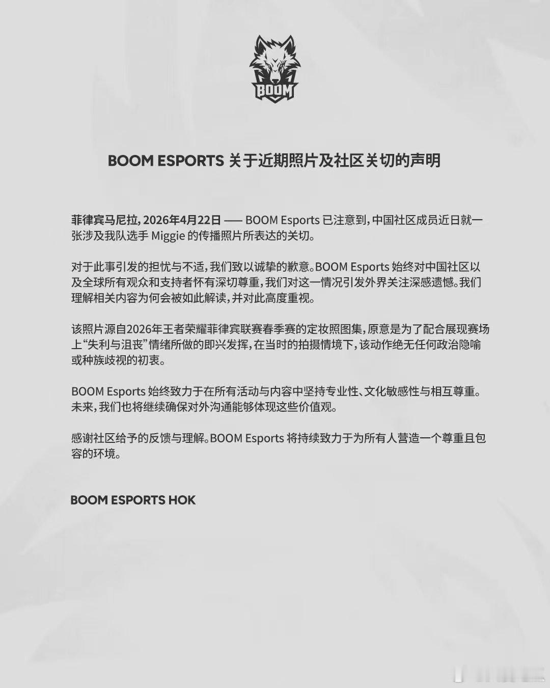 梳理一下:*对于相关的争议手势,对所有观众表达歉意*BOOM战队和选手Miggie本人目前都以双语形式做了说明与致歉*赛事主办方后续将全面加强文化敏感性审核机制* 另外翻看Miggie 本人之前的社交媒体,也表达对KPL选手的喜欢