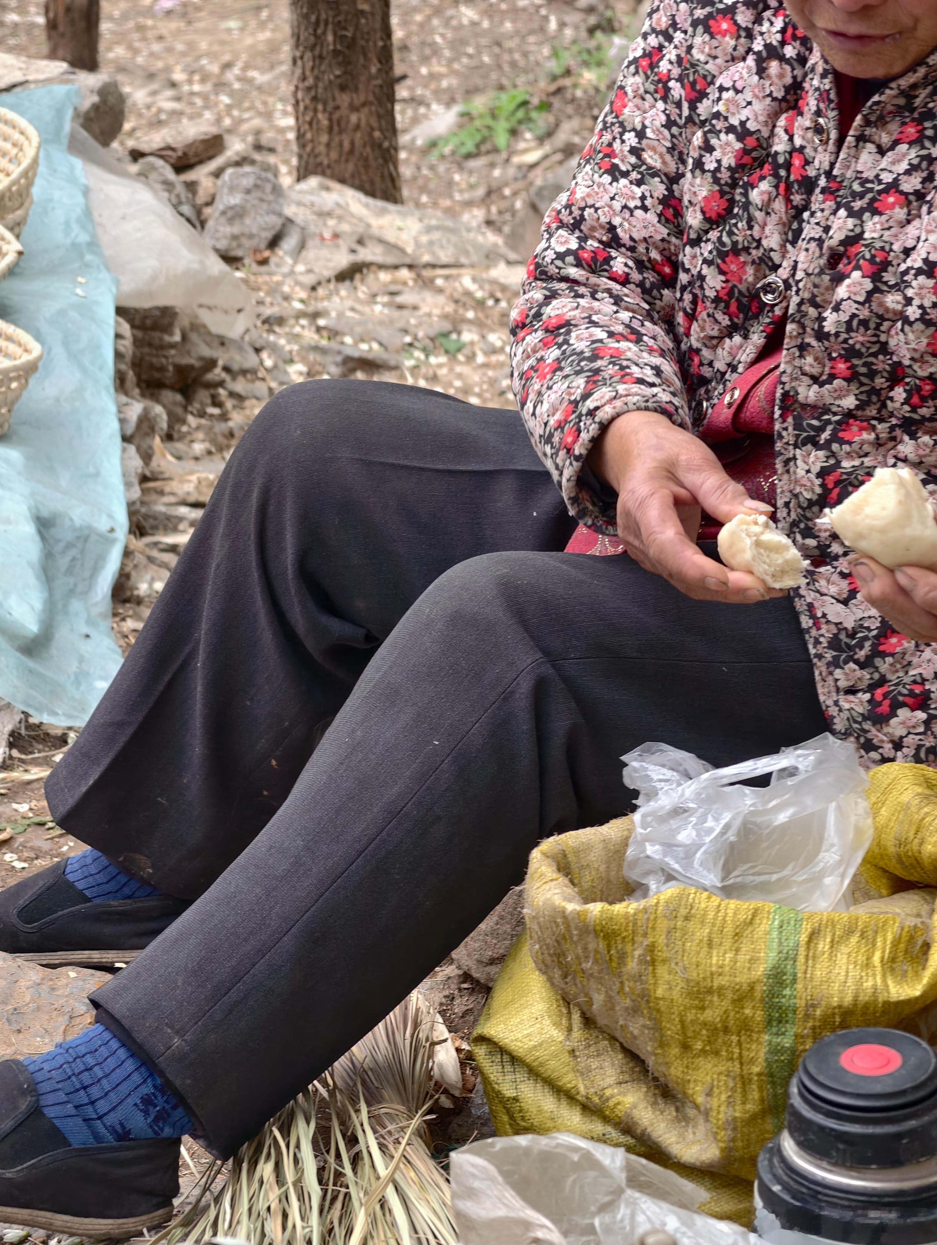 我在半山坡的摊位旁等着上山的爷爷,旁边摆摊的大娘问我几点了。我看表告诉她,十二点半。大娘念叨,都十二点半啦,该吃饭了。